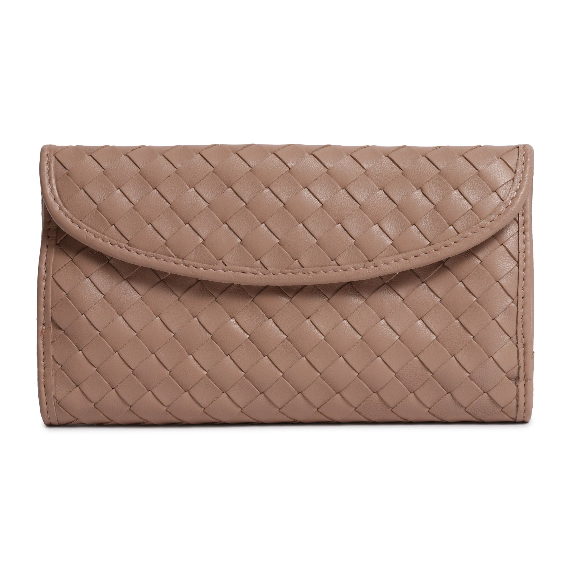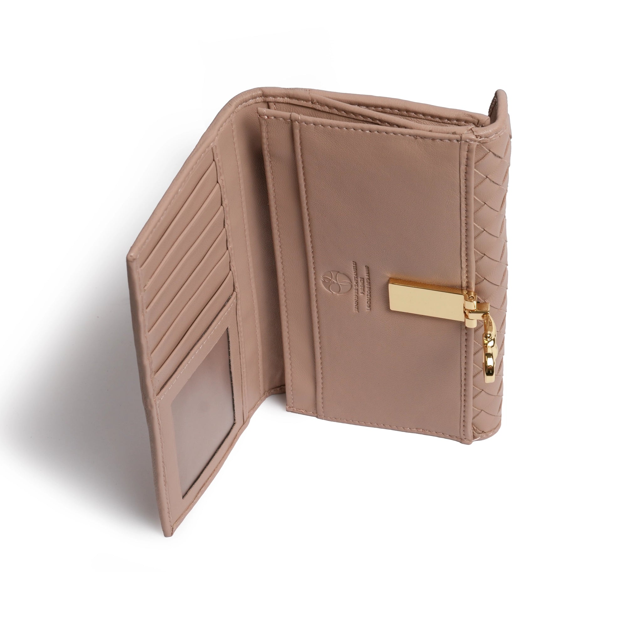 The Ladies Leather Wallet with Horsebit in Caffellatte (light mocha) is a beautiful accessory to hold all of the essentials, like your cash, credit cards, coins, and even small items like jewelry. It features a smooth nappa design with a single woven panel and intricate square weave technique, handmade in Italy with the finest lamb skin material.