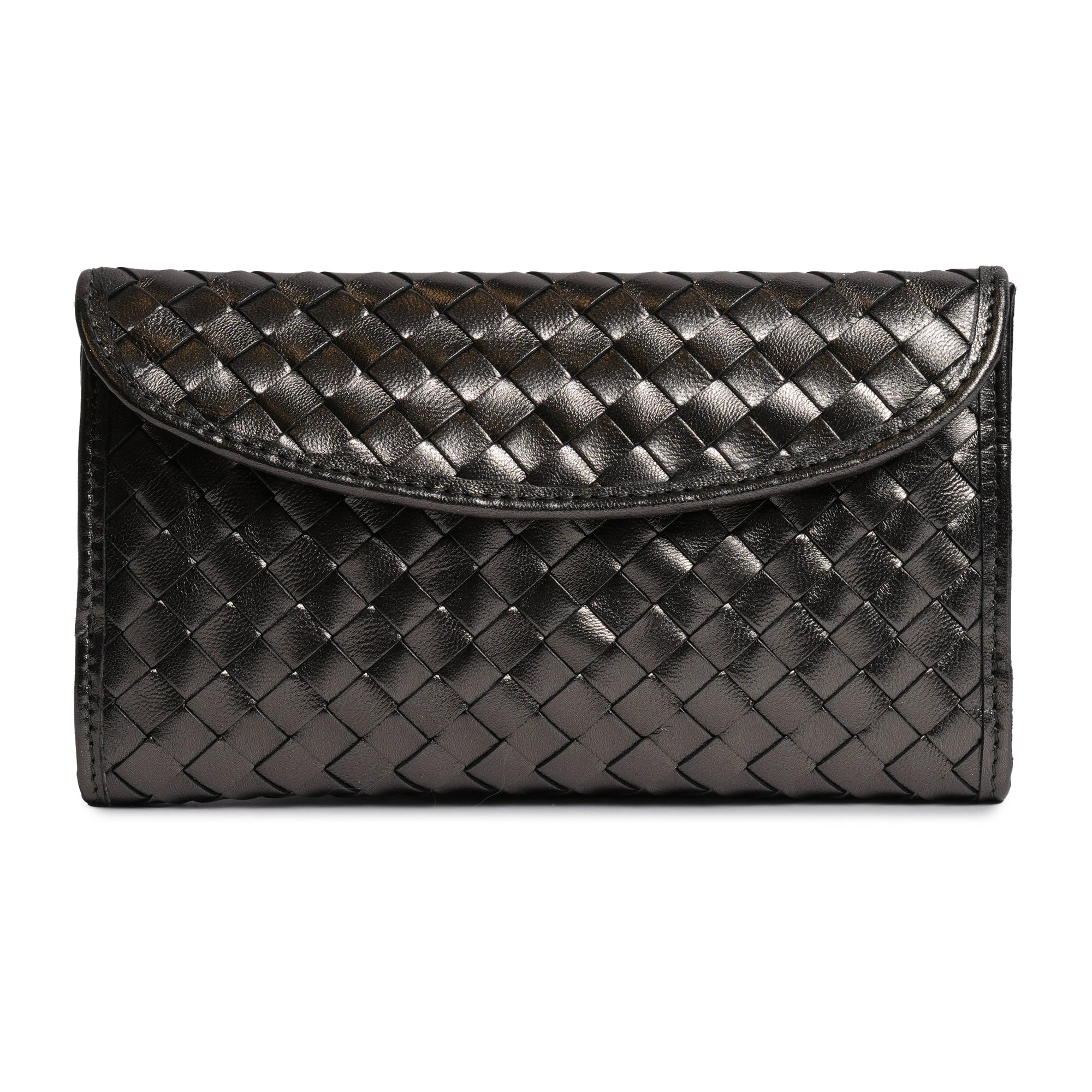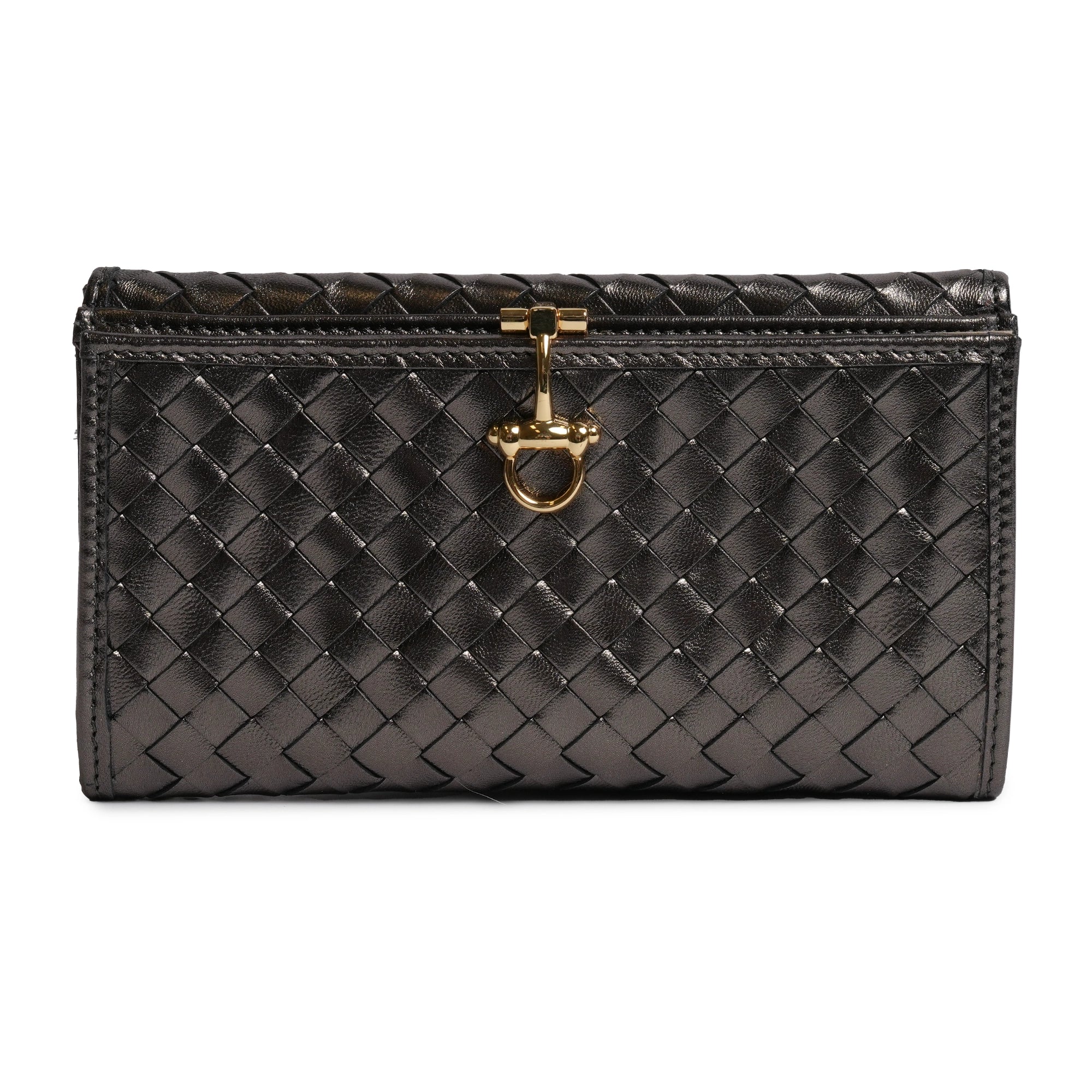 The Ladies Leather Wallet with Horsebit in Laminated Gunmetal is a beautiful accessory to hold all of the essentials, like your cash, credit cards, coins, and even small items like jewelry. It features a smooth nappa design with a single woven panel and intricate square weave technique, handmade in Italy with the finest lamb skin material.
