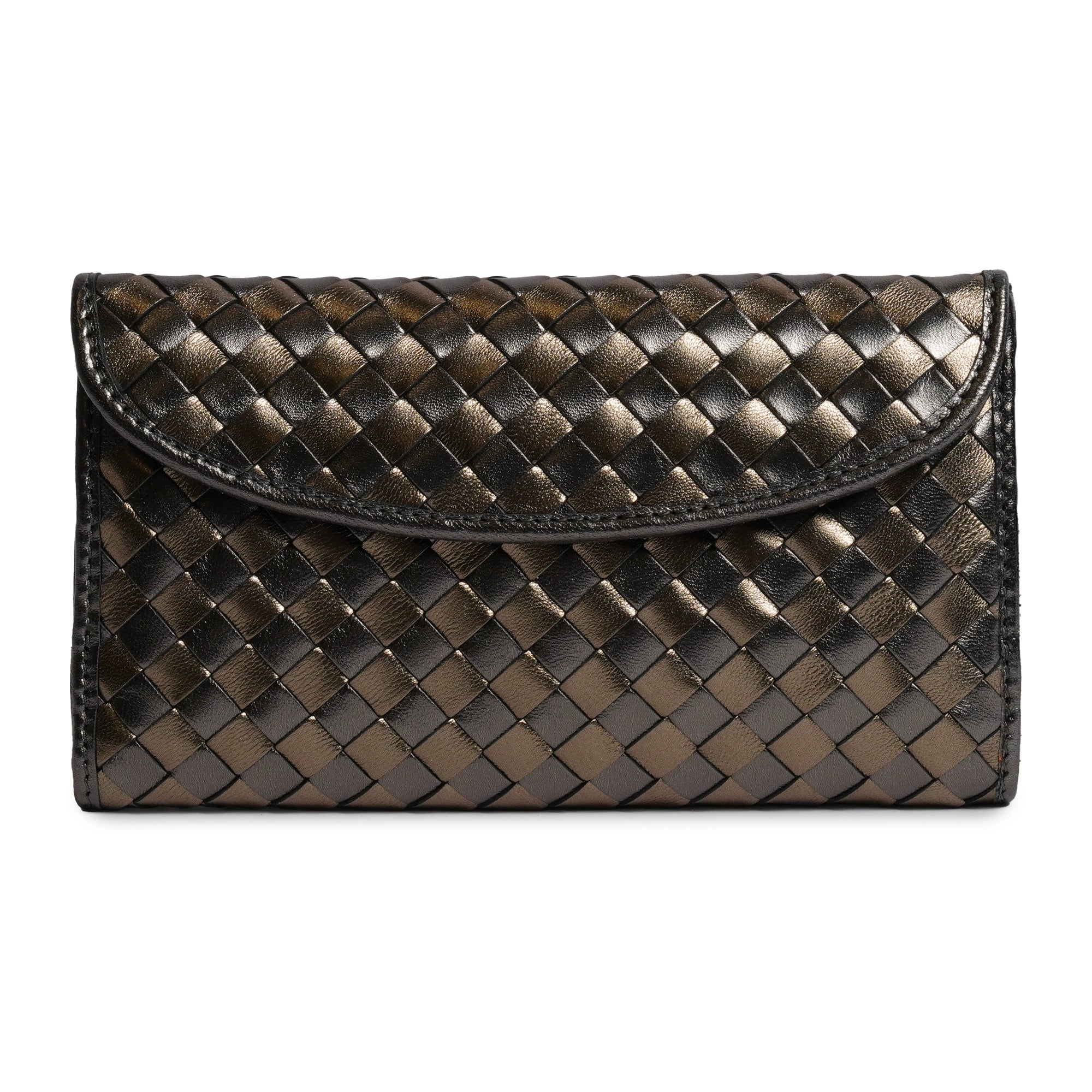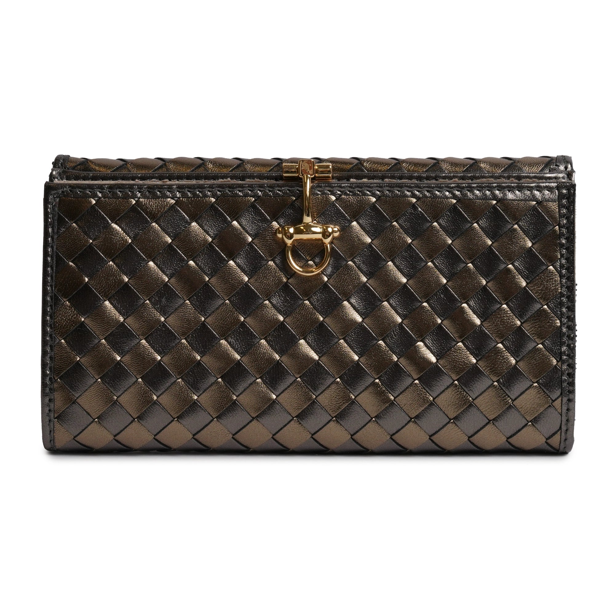 The Ladies Leather Wallet with Horsebit in Laminated Gunmetal and Bronze is a beautiful accessory to hold all of the essentials, like your cash, credit cards, coins, and even small items like jewelry. It features a smooth nappa design with a single woven panel and intricate square weave technique, handmade in Italy with the finest lamb skin material.