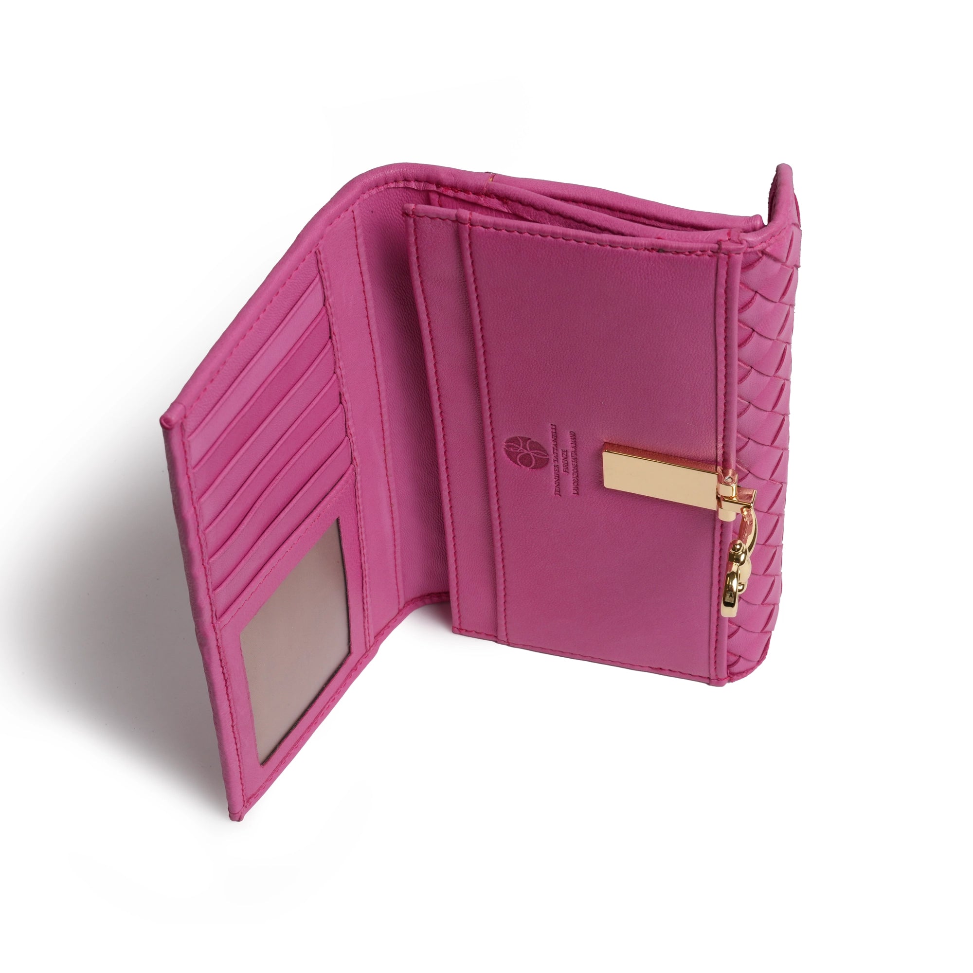 The Ladies Leather Wallet with Horsebit in Fucsia is a beautiful accessory to hold all of the essentials, like your cash, credit cards, coins, and even small items like jewelry. It features a smooth nappa design with a single woven panel and intricate square weave technique, handmade in Italy with the finest lamb skin material.