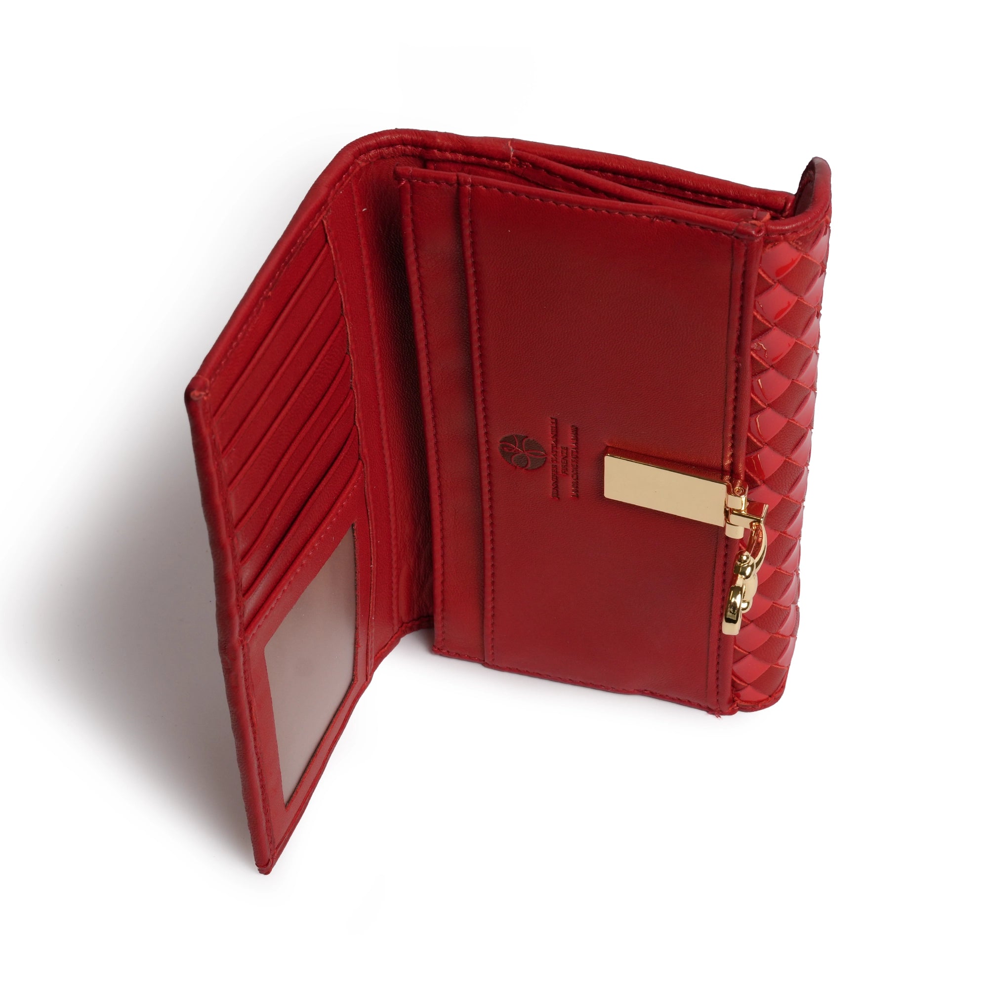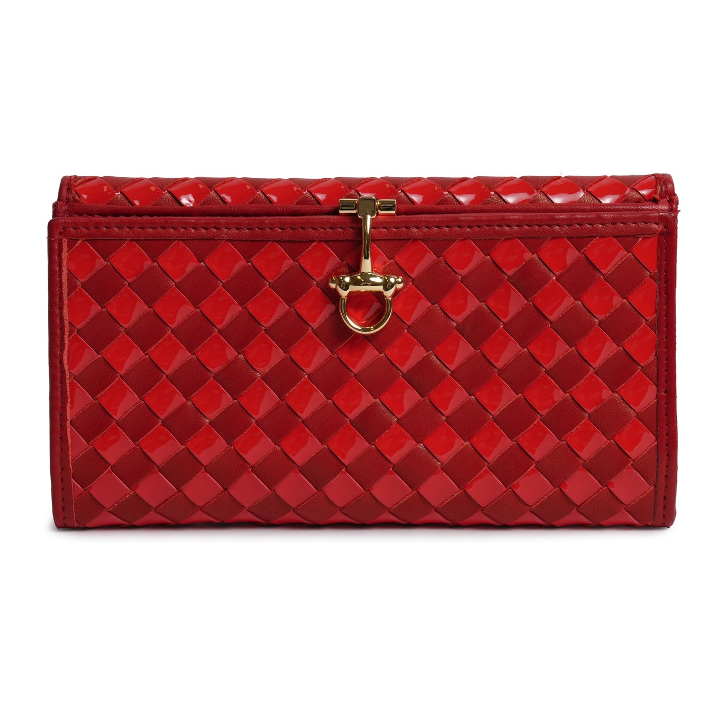 The Ladies Leather Wallet with Horsebit in Red is a beautiful accessory to hold all of the essentials, like your cash, credit cards, coins, and even small items like jewelry. It features a smooth nappa design with a single woven panel and intricate square weave technique, handmade in Italy with the finest lamb skin material.