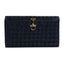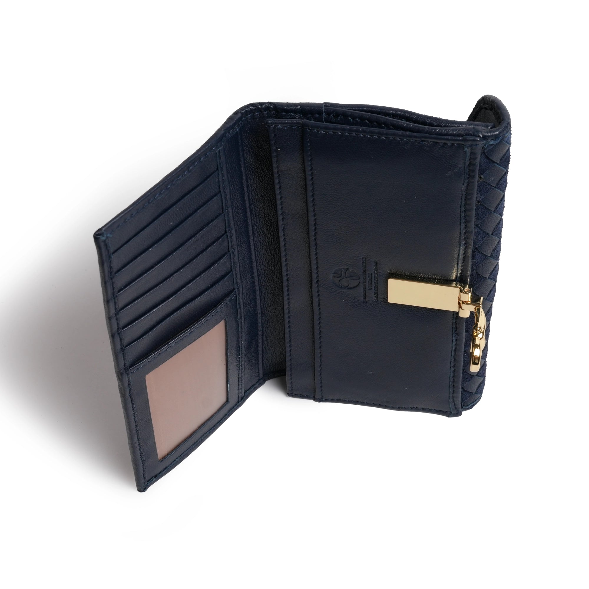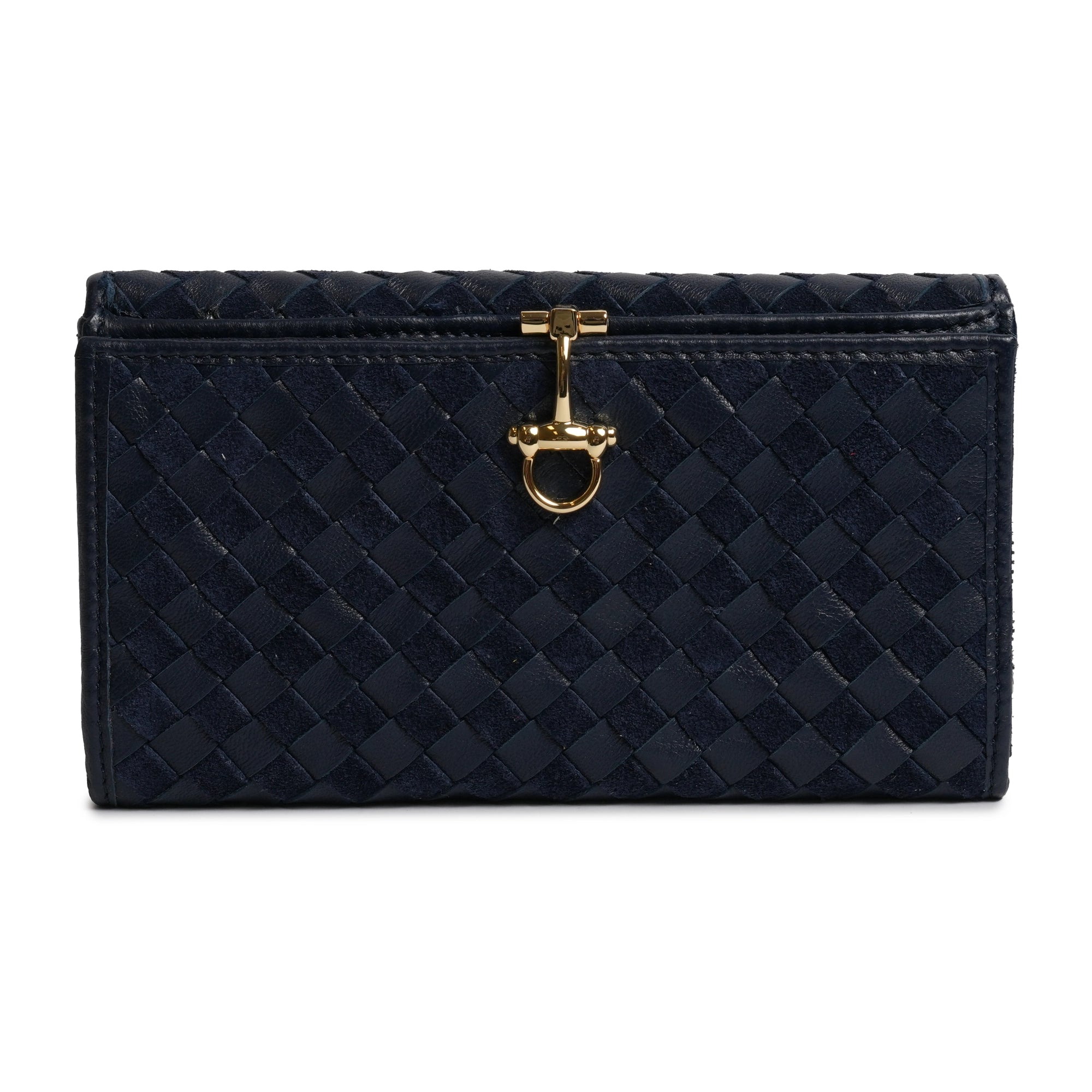 The Ladies Leather Wallet with Horsebit in Blue is a beautiful accessory to hold all of the essentials, like your cash, credit cards, coins, and even small items like jewelry. It features a smooth nappa design with a single woven panel and intricate square weave technique, handmade in Italy with the finest lamb skin material.