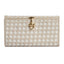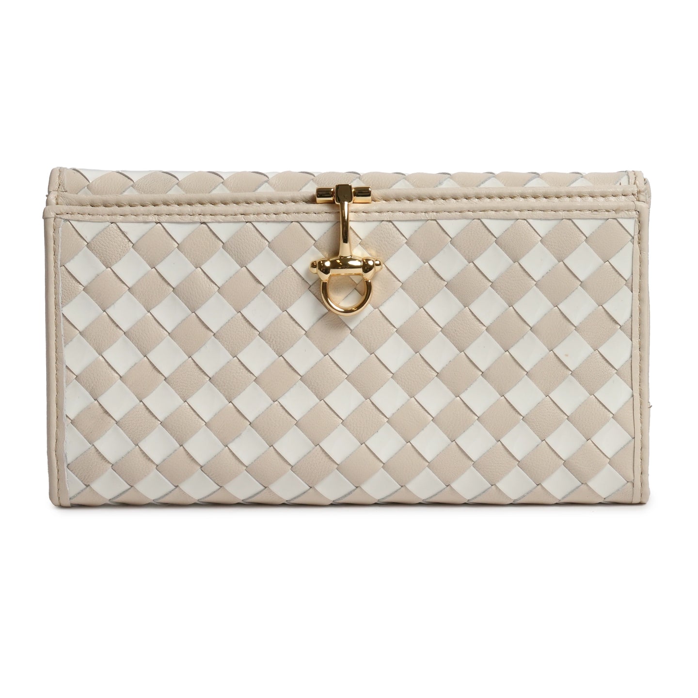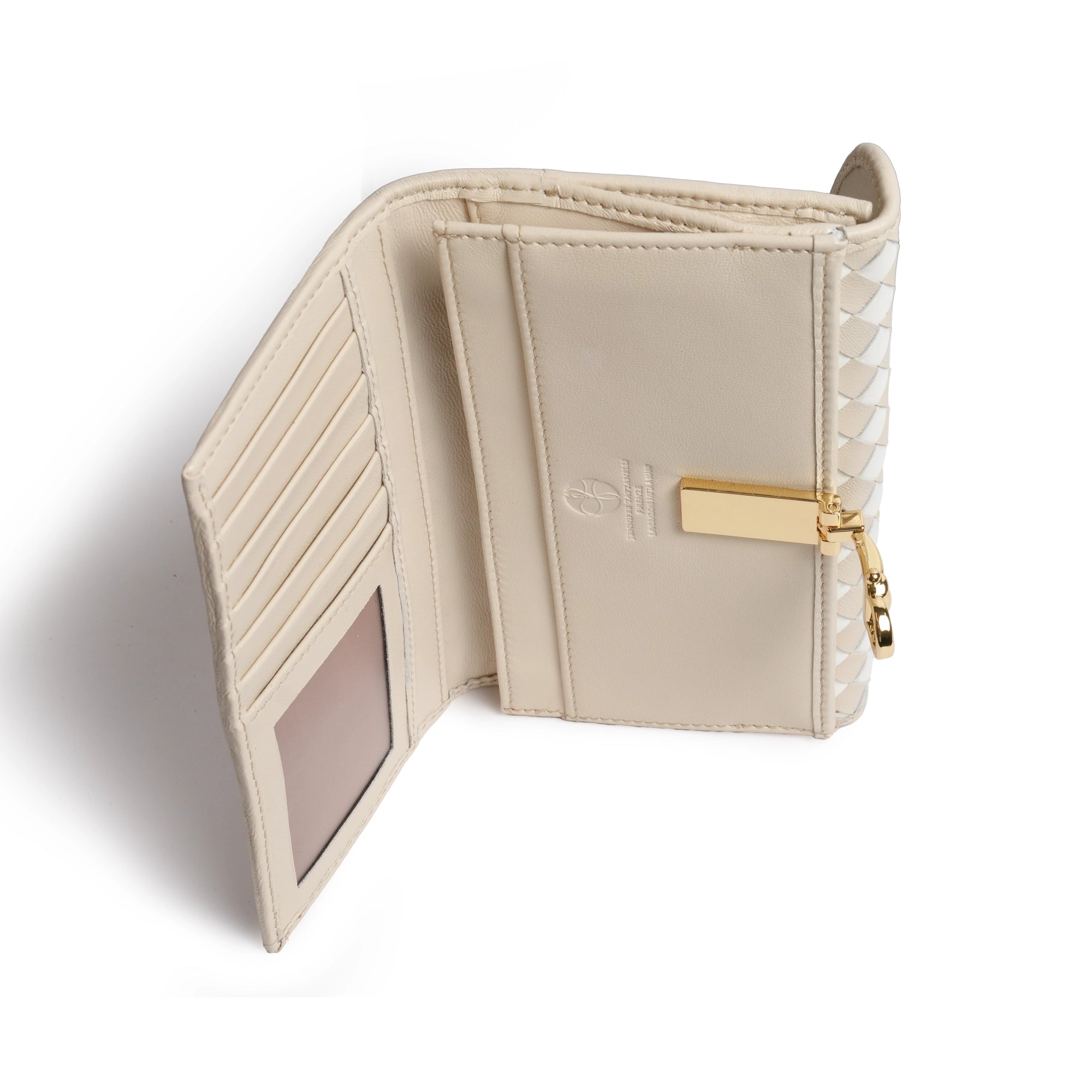 The Ladies Leather Wallet with Horsebit in Ivory and White is a beautiful accessory to hold all of the essentials, like your cash, credit cards, coins, and even small items like jewelry. It features a smooth nappa design with a single woven panel and intricate square weave technique, handmade in Italy with the finest lamb skin material.