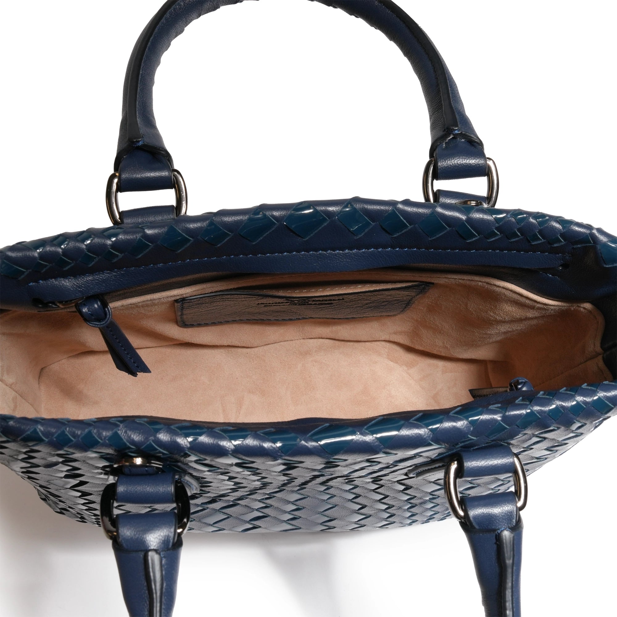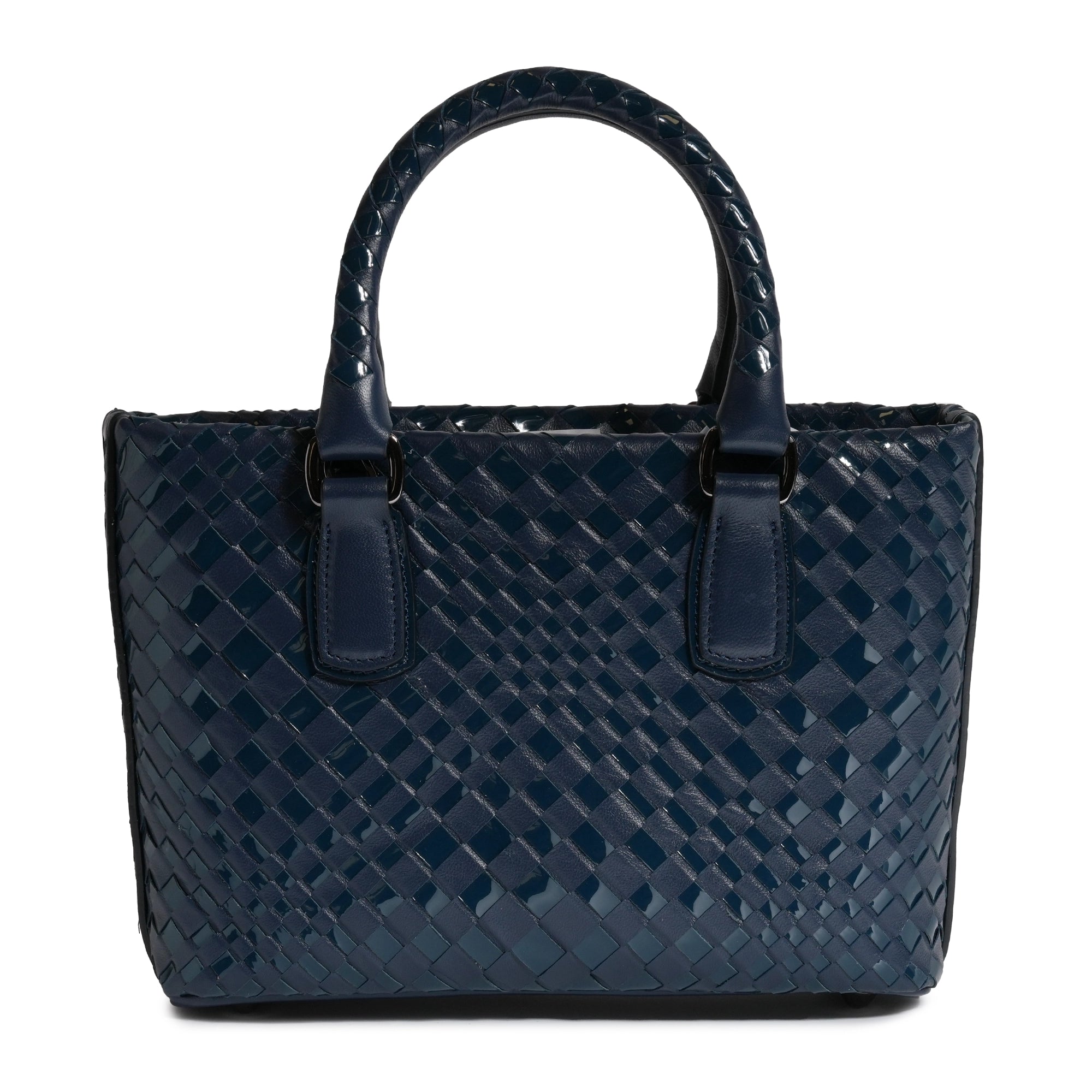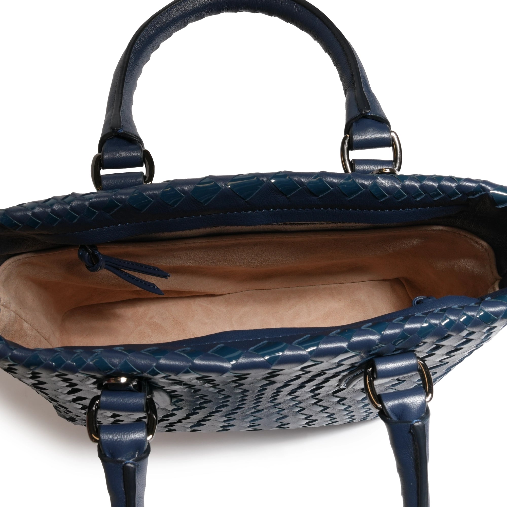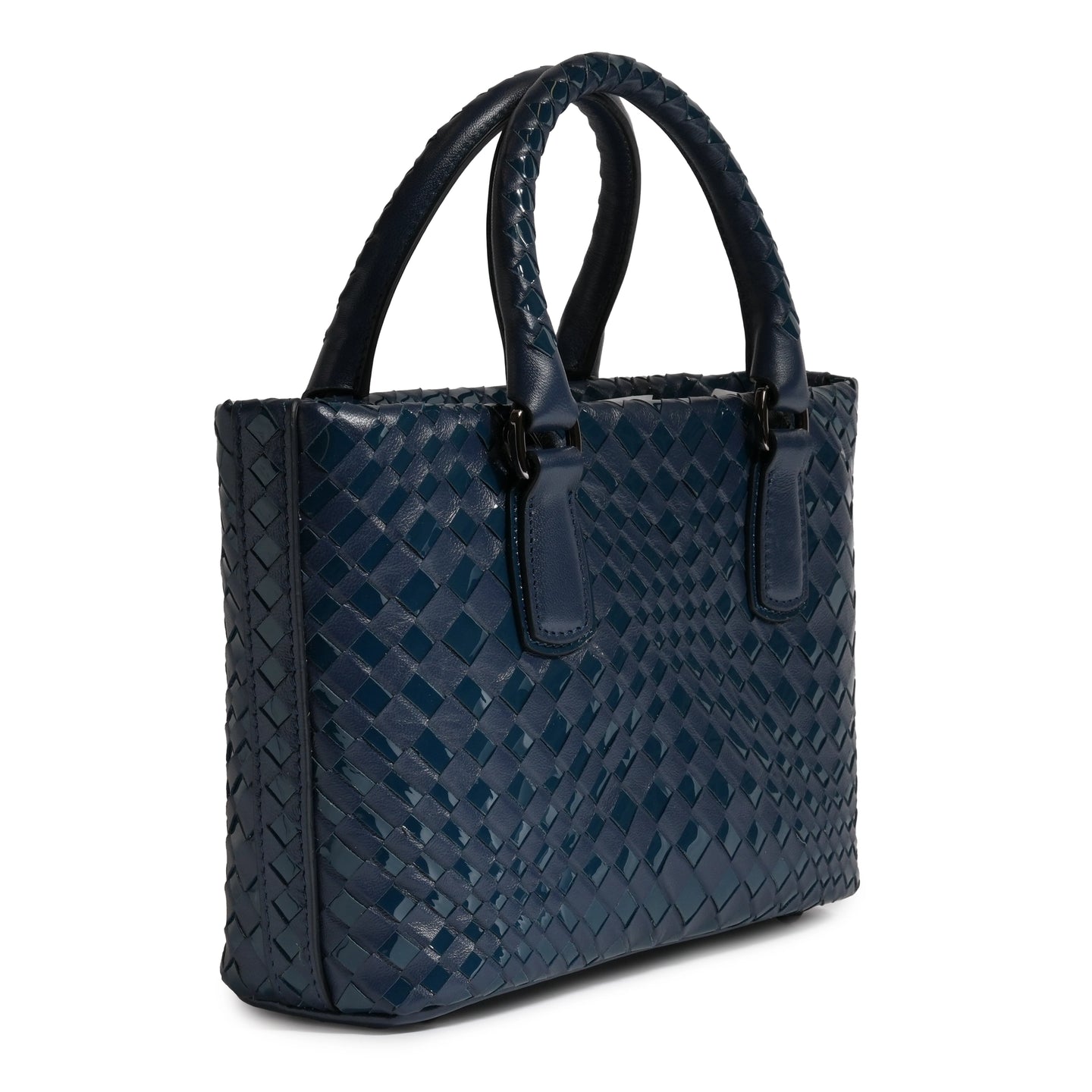 Enjoy this Women’s Mini Top Handle Madison Leather Intrecciato Bag in Nappa Carta da Zucchero (deep blue) and Patent, a sophisticated blend of timeless craftsmanship and modern design. Handcrafted from luxurious Nappa leather, this bag exudes elegance in every detail, with a rich carta da zucchero patent leather hue that adds a contemporary edge to a classic silhouette.