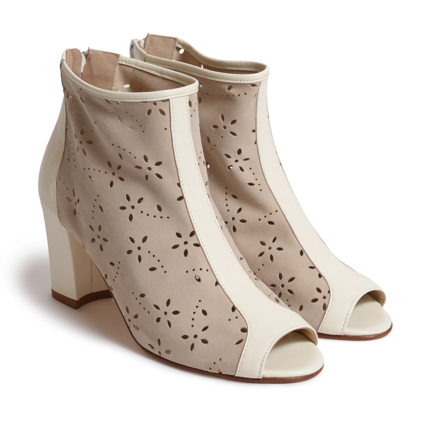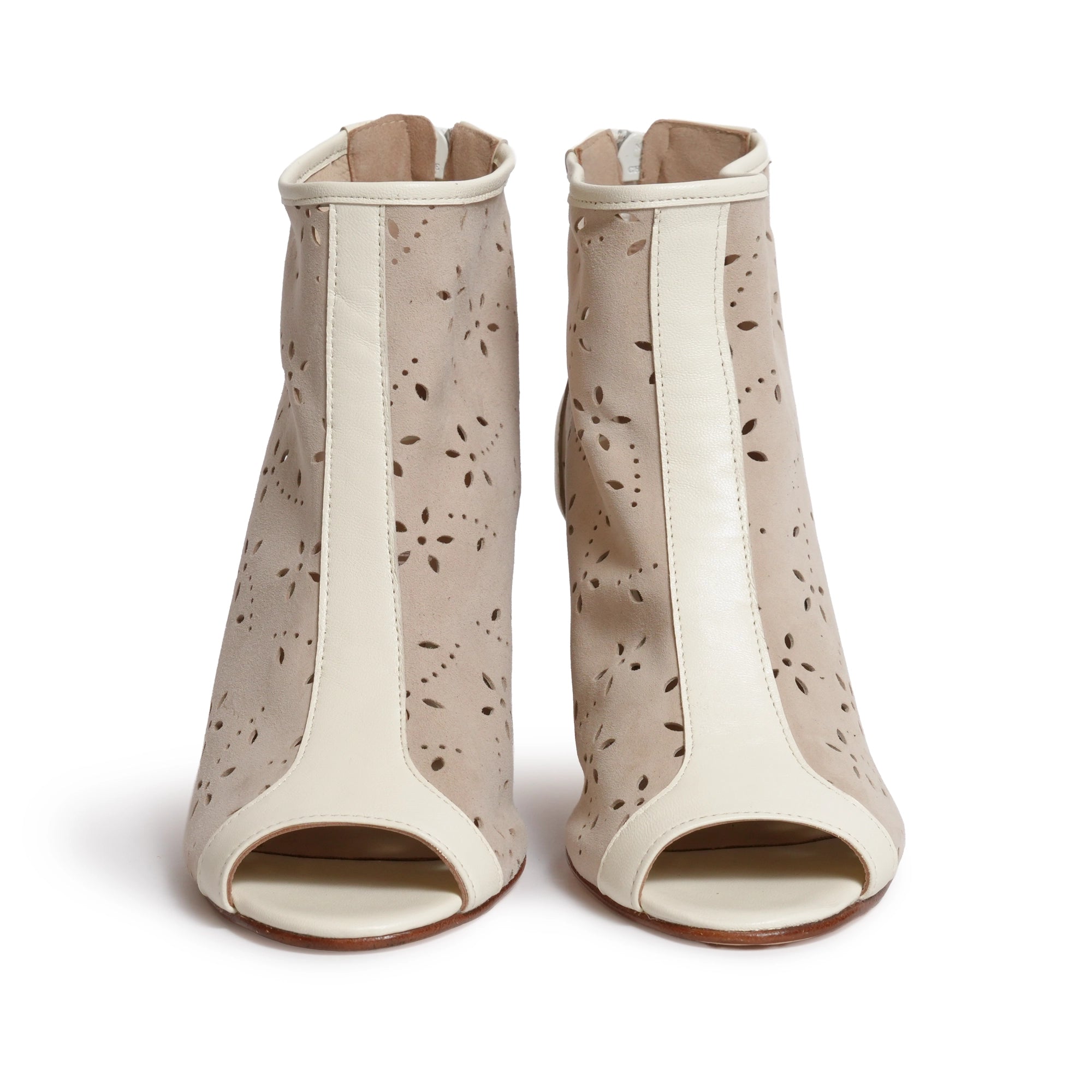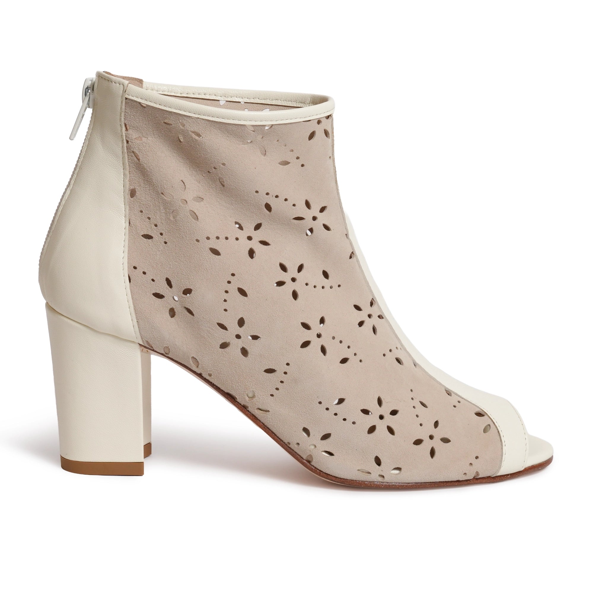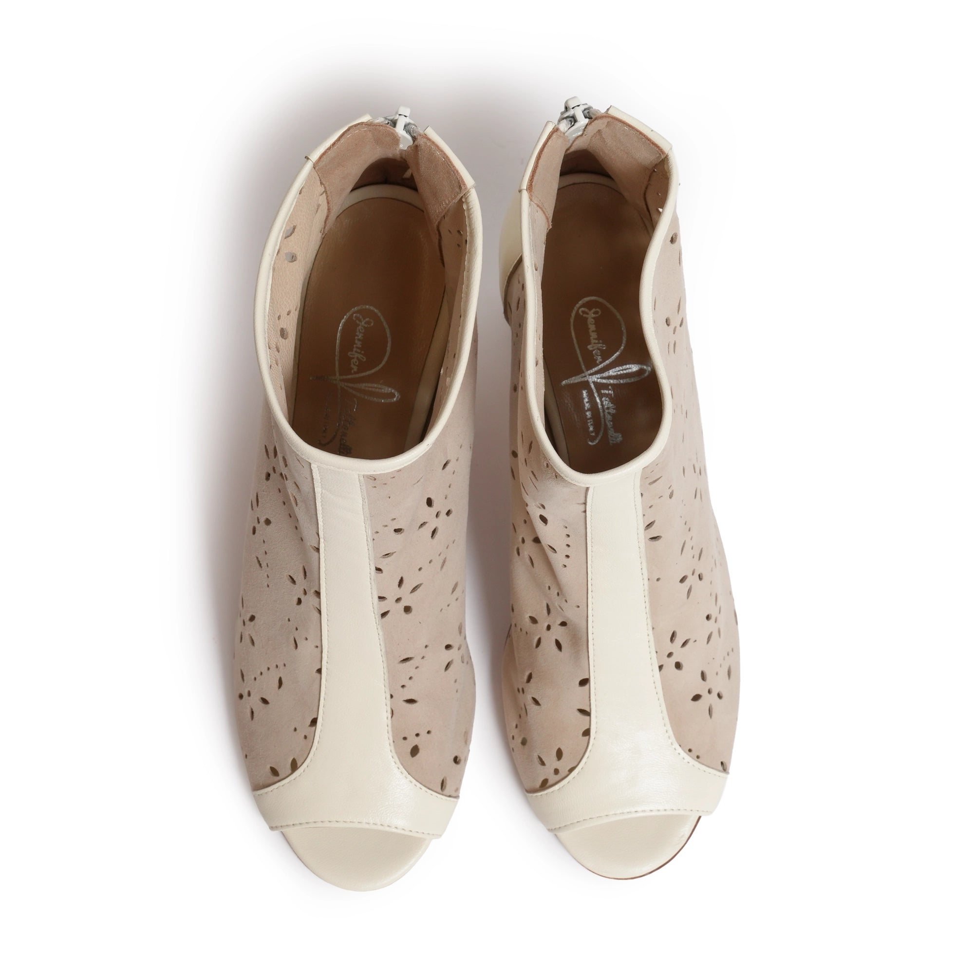 Introducing Jennifer Tattanelli Handmade Open Toe Ankle Booties in Ivory with Flower-Patterned Cut-Out Details. These exquisite booties are a true testament to craftsmanship and artistry, meticulously handcrafted to bring sophistication and a touch of floral elegance to your footwear collection.