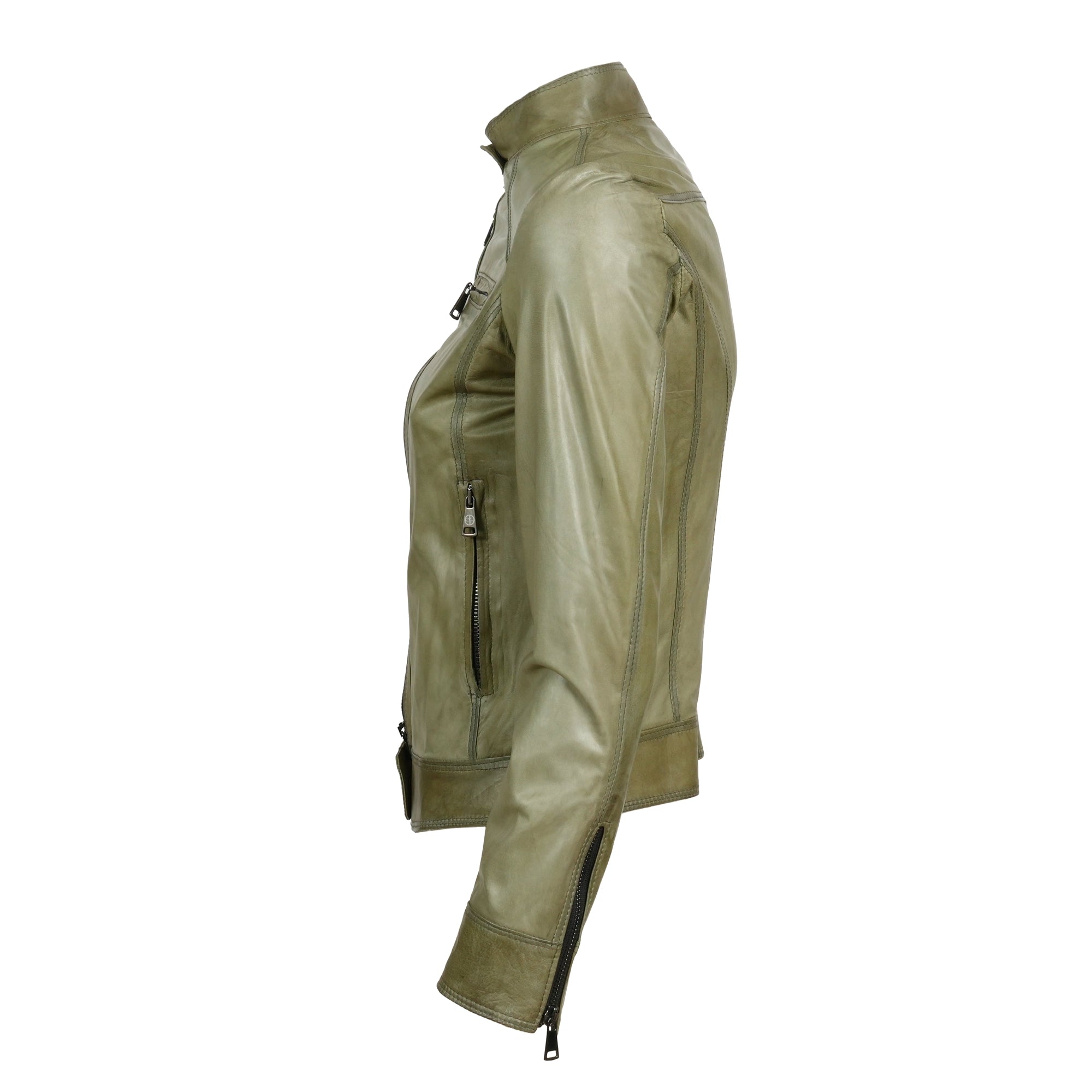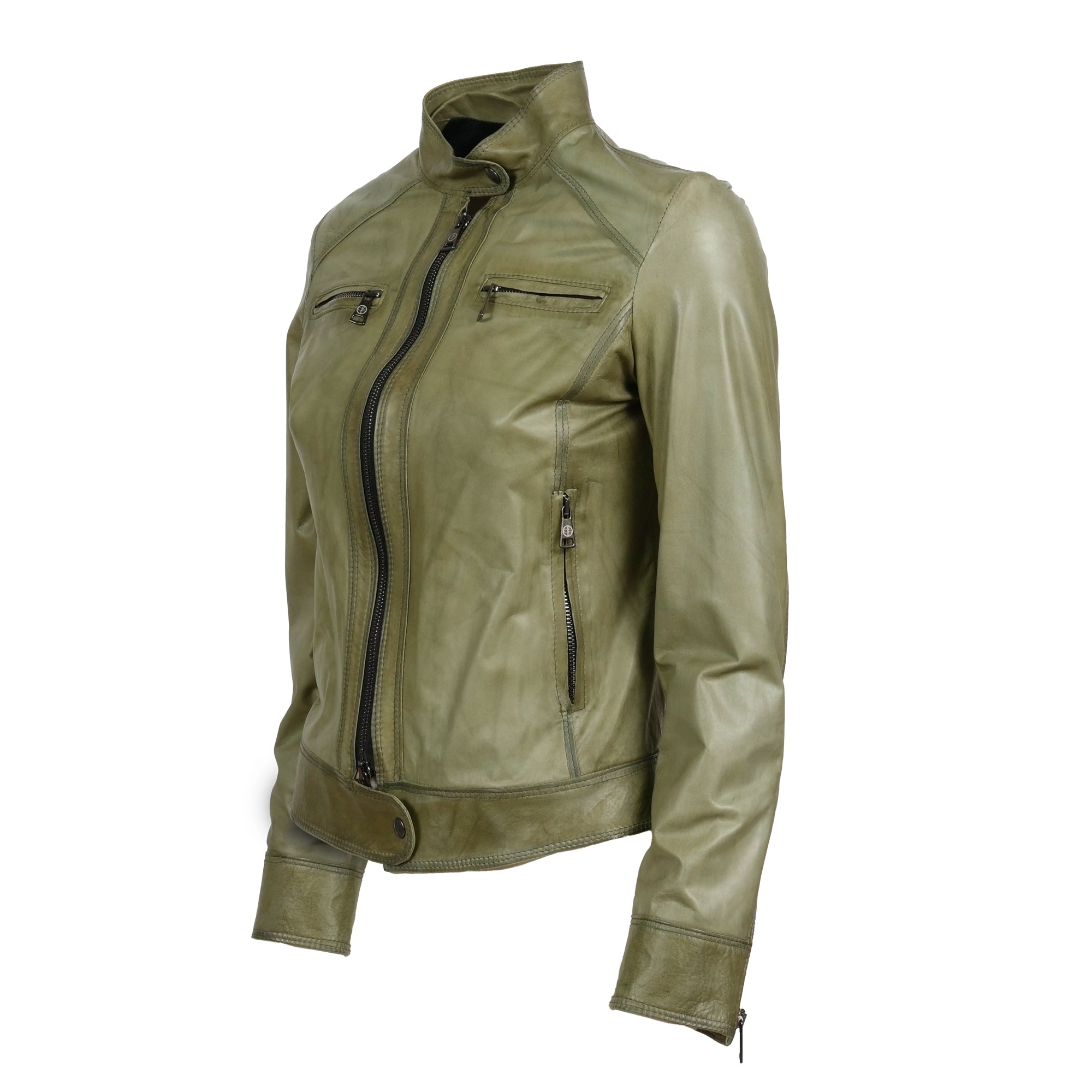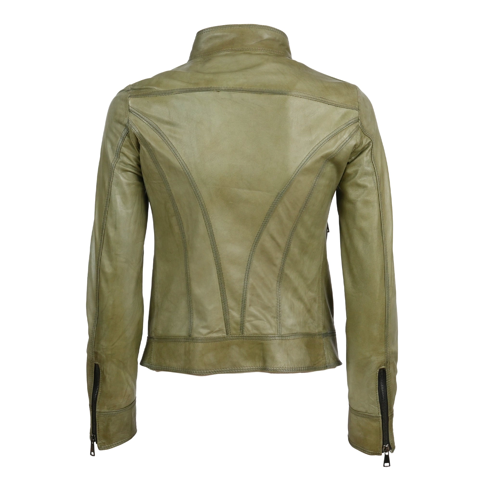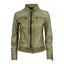 Style this Green leather biker jacket with black jeans and ankle boots for a chic, casual look, or pair it with a midi skirt and heels for a refined evening outfit. The muted green tone adds a sophisticated pop of color that transitions effortlessly across seasons.