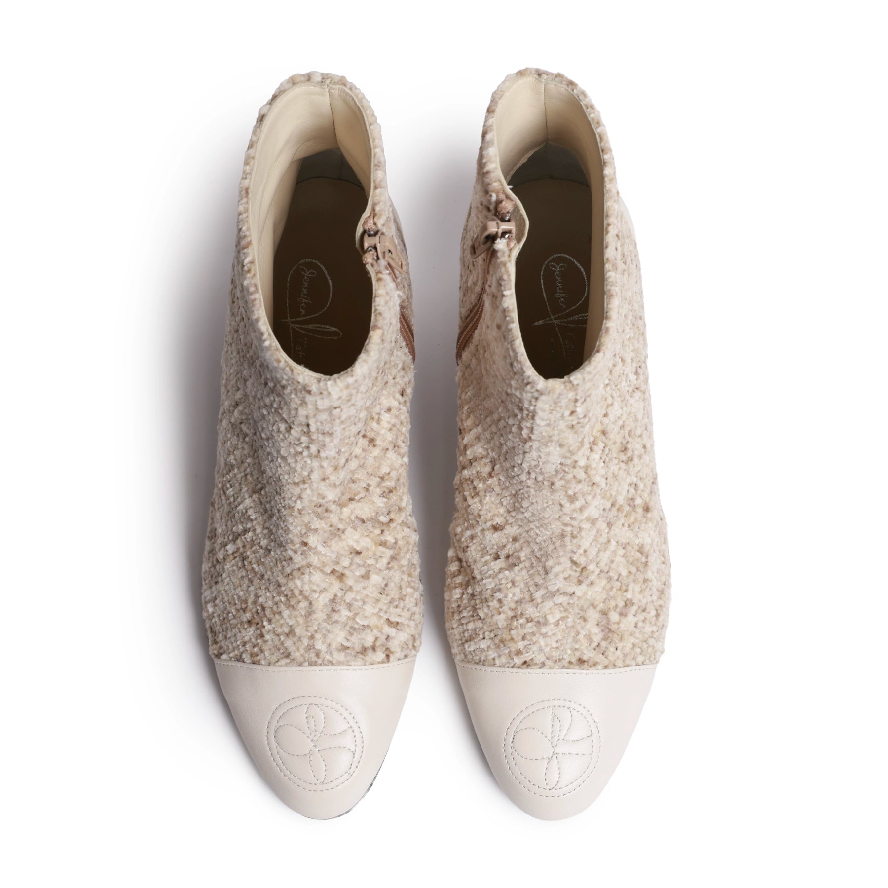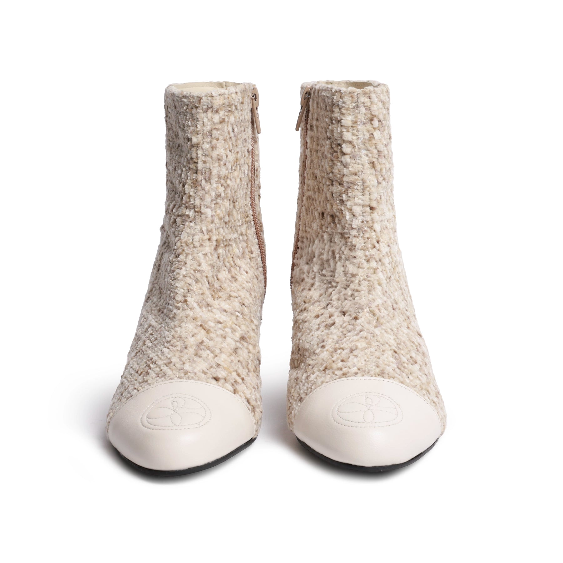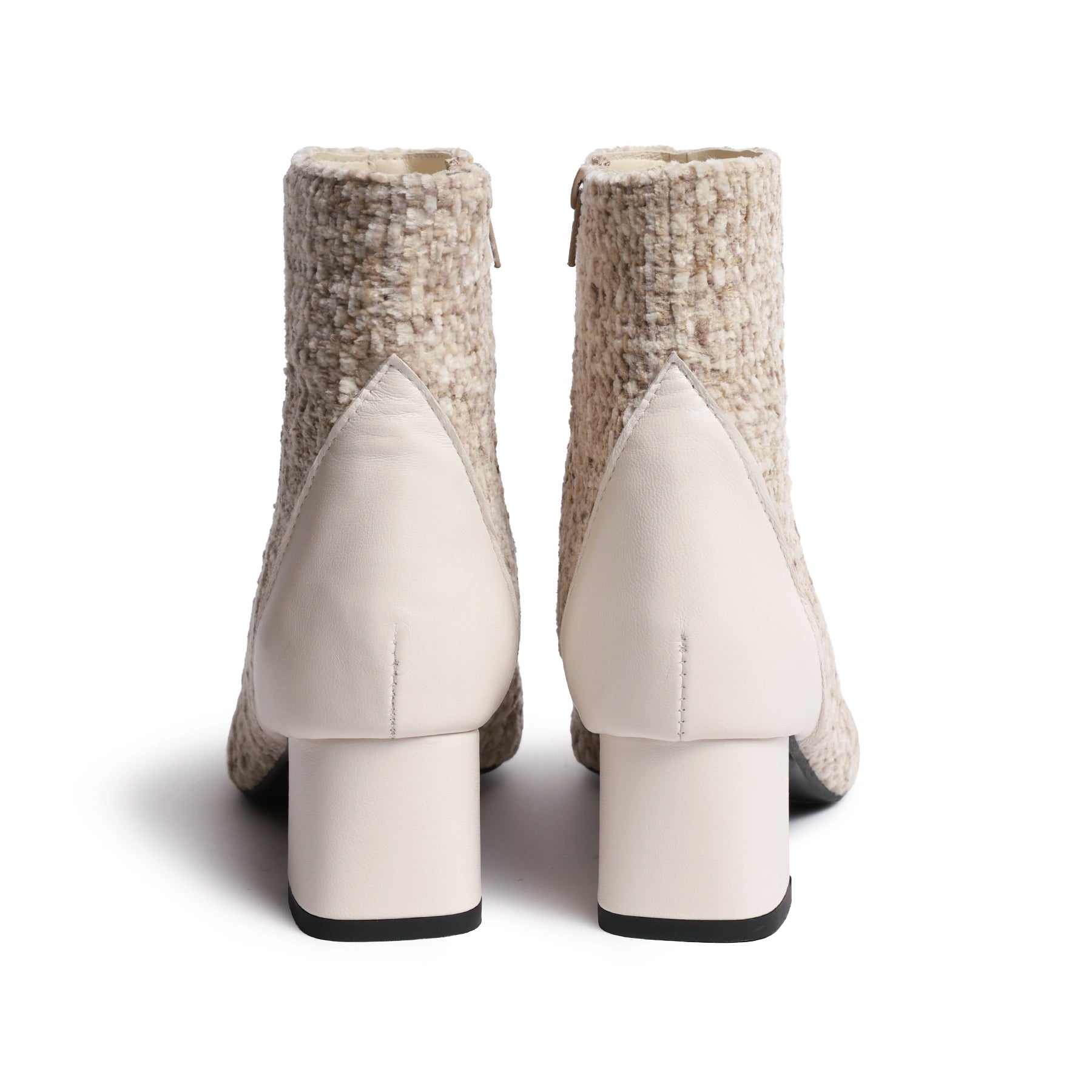 Crafted in Florence, Italy, these ankle boots combine Ivory Nappa Leather with a richly textured tweed upper, creating a refined and seasonal look.