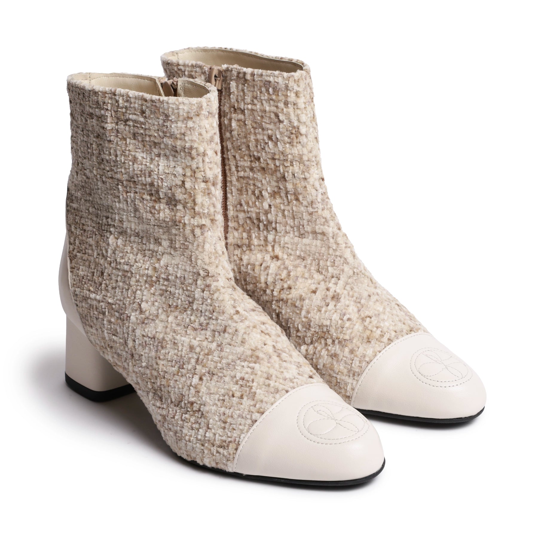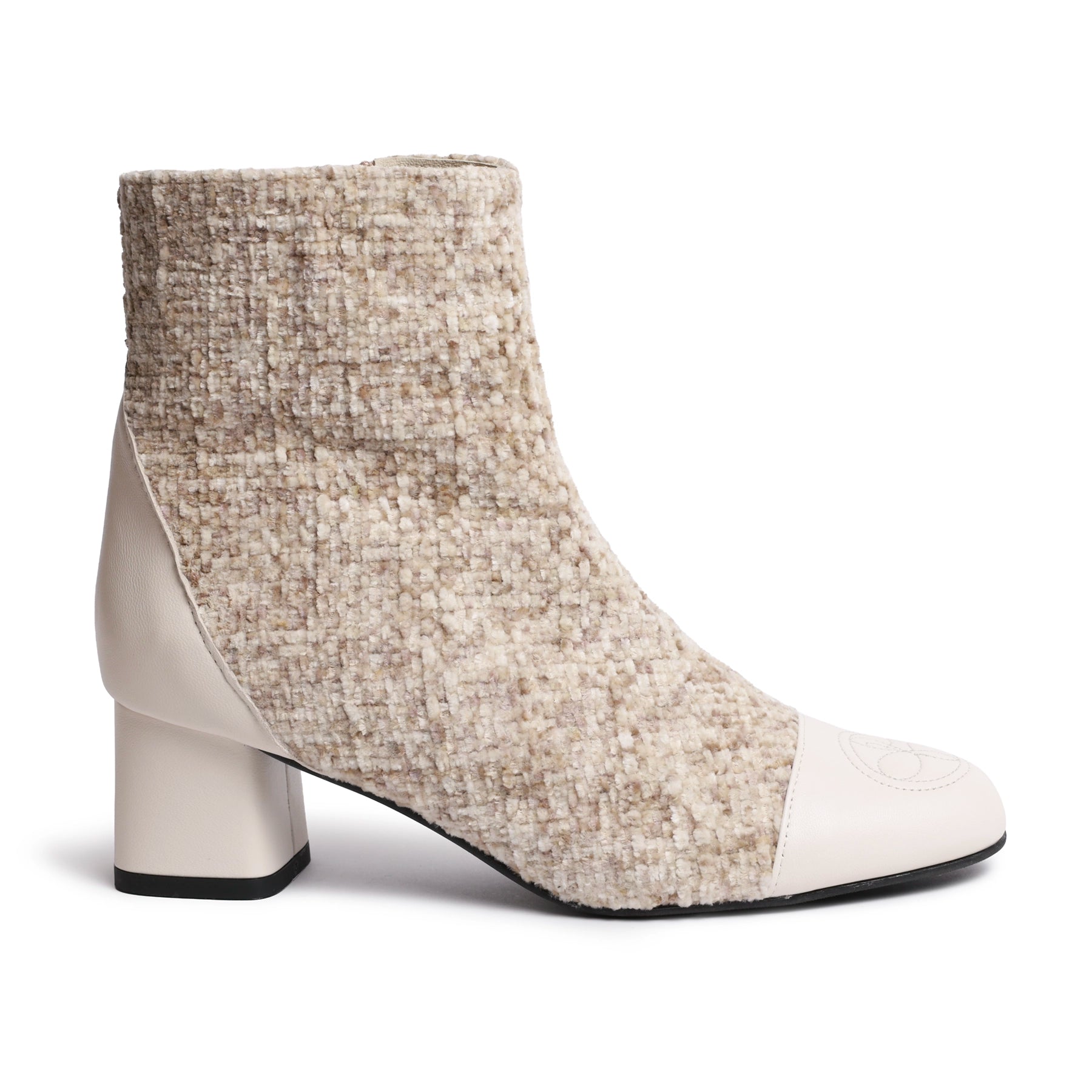 Women’s Leather and Tweed Block Ankle Booties in Ivory