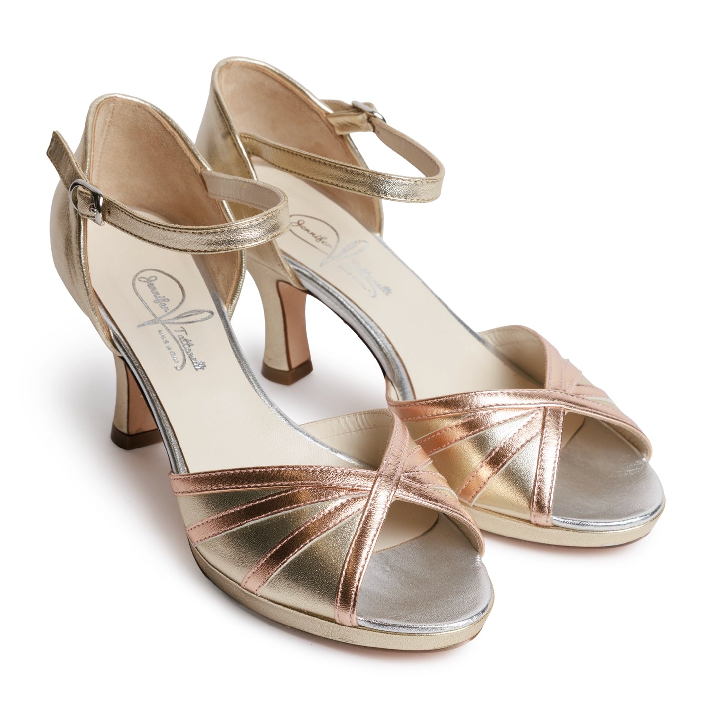 The style features a slender ankle strap with an adjustable buckle, ensuring a secure and feminine fit. A discreet small platform at the front provides subtle lift and additional comfort, complementing the open-toe design that enhances the natural line of the foot.