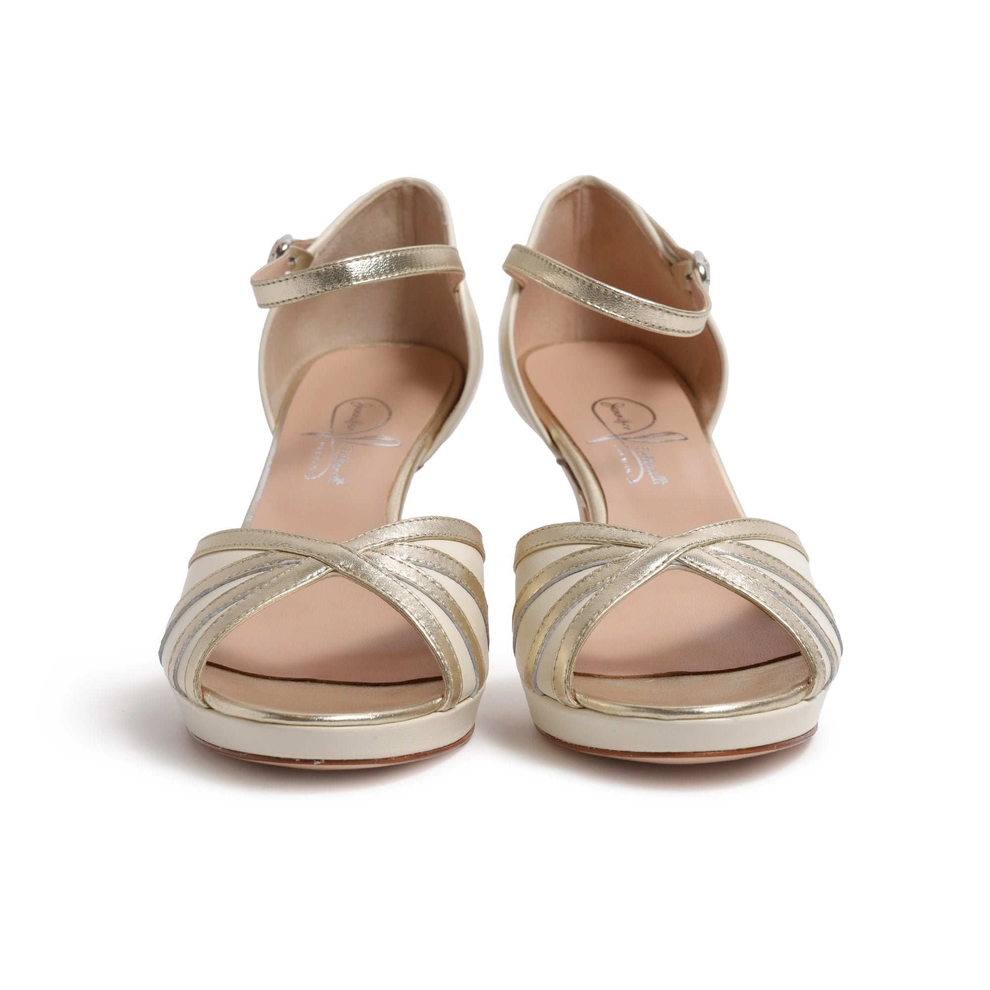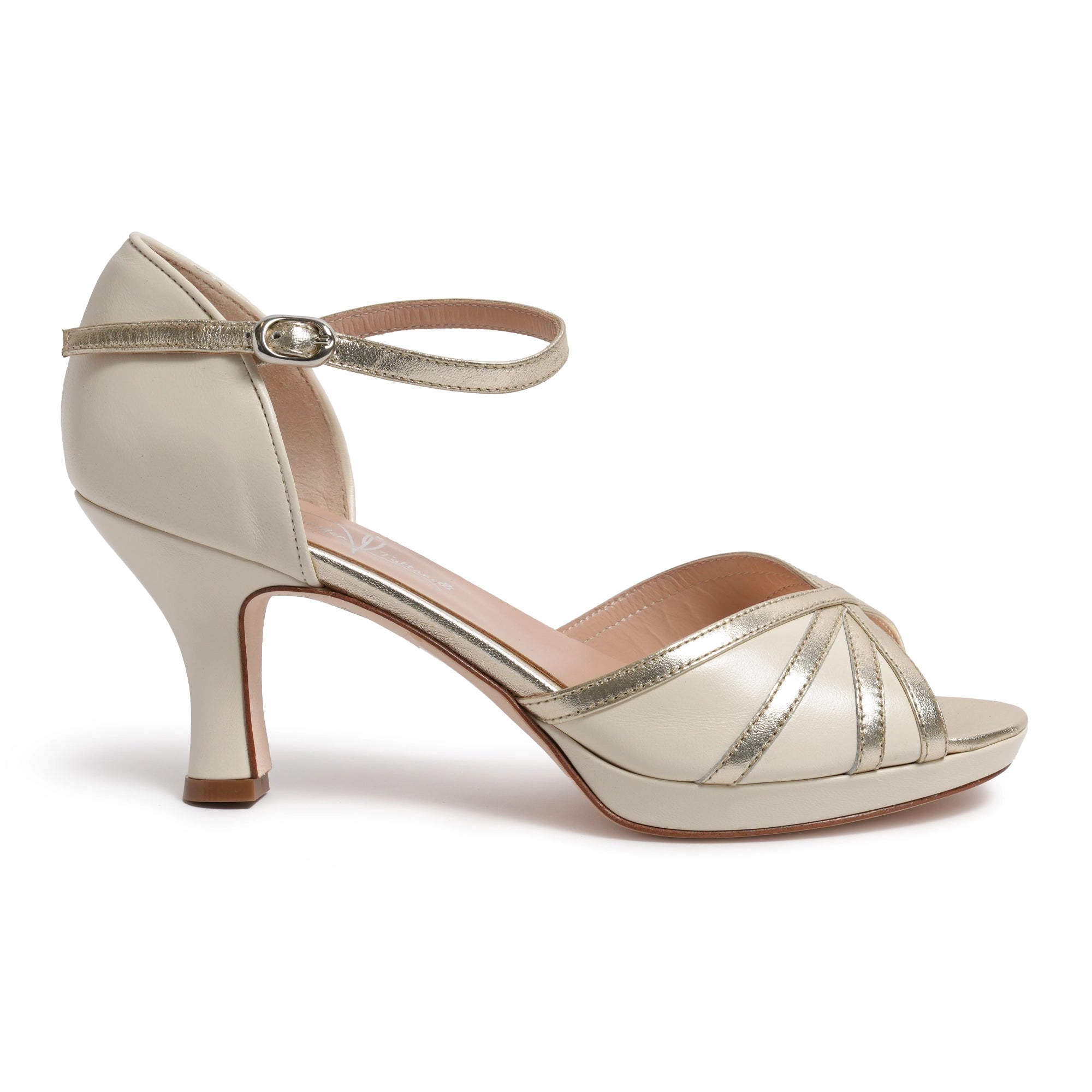 The style features a slender ankle strap with an adjustable buckle, ensuring a secure and feminine fit. A discreet small platform at the front provides subtle lift and additional comfort, complementing the open-toe design that enhances the natural line of the foot.