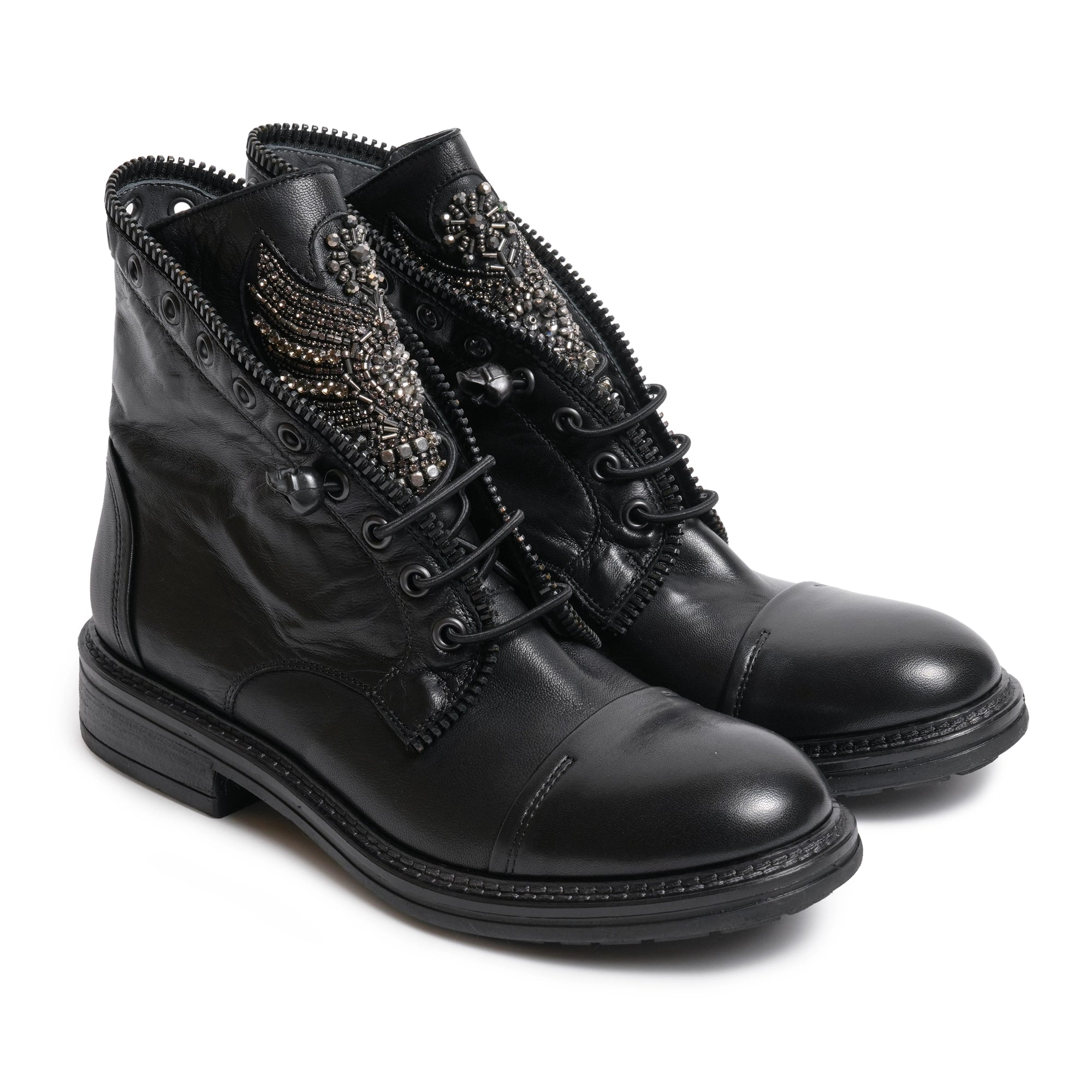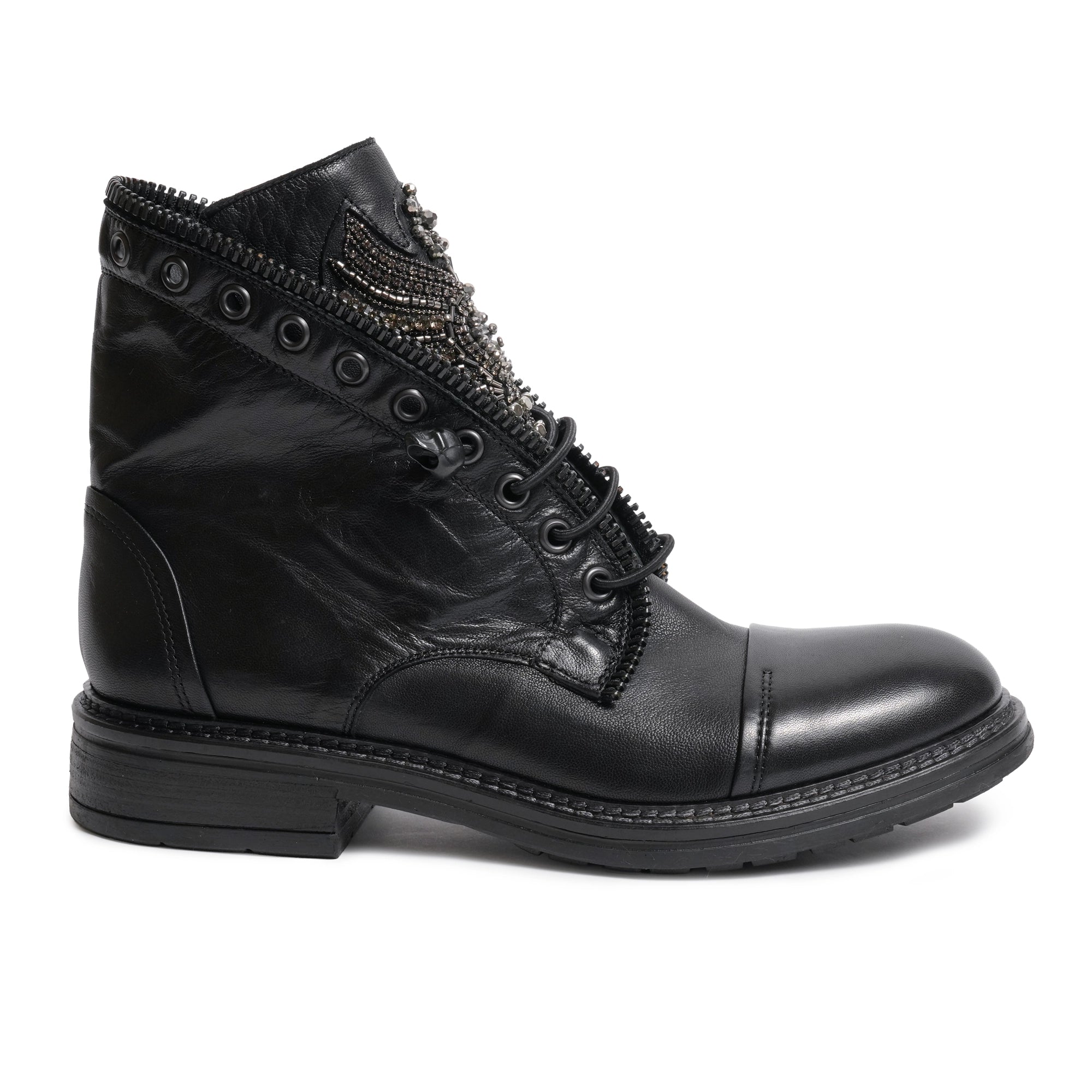 Turn heads with every step in these Women's Combat Booties with Crystal Embroidery.
