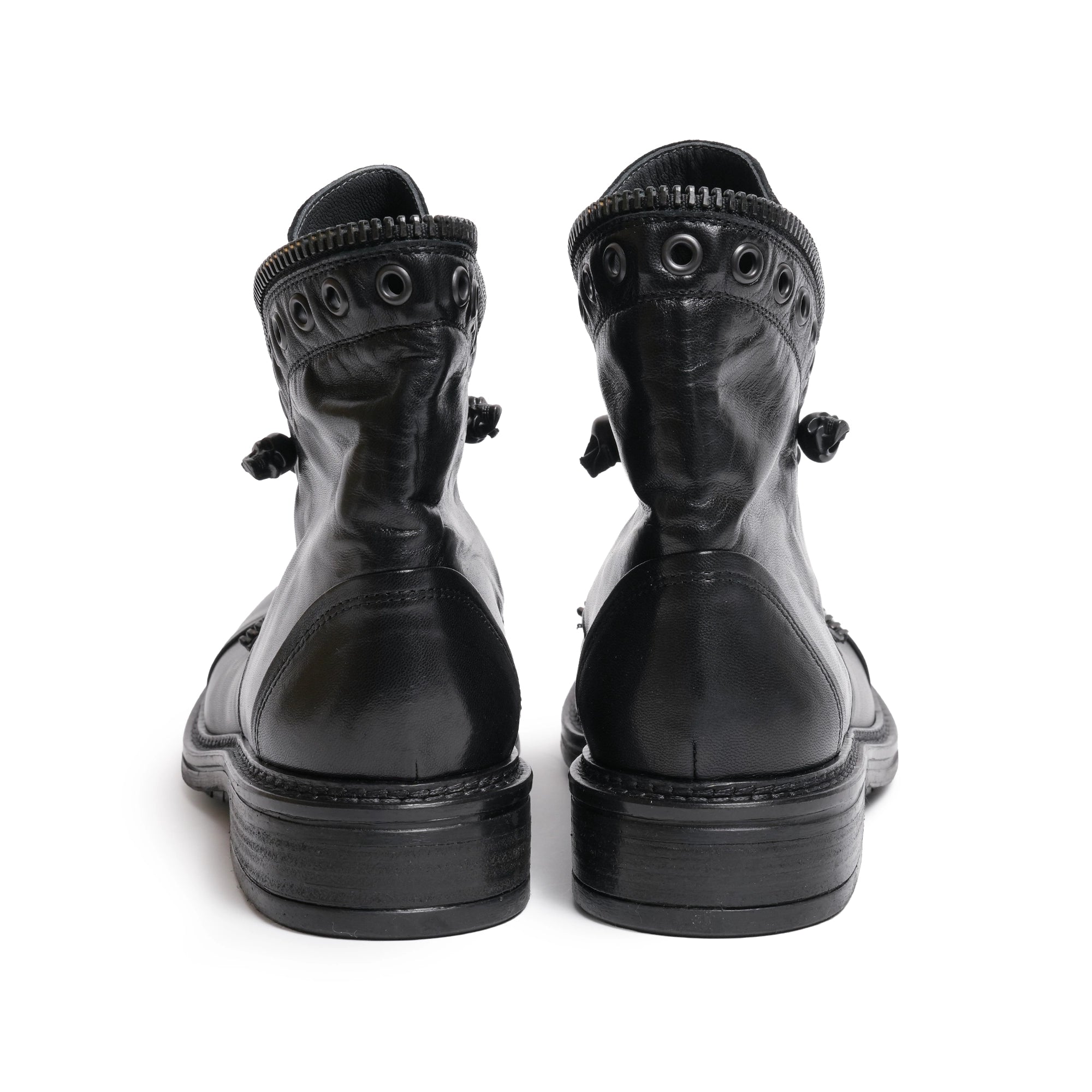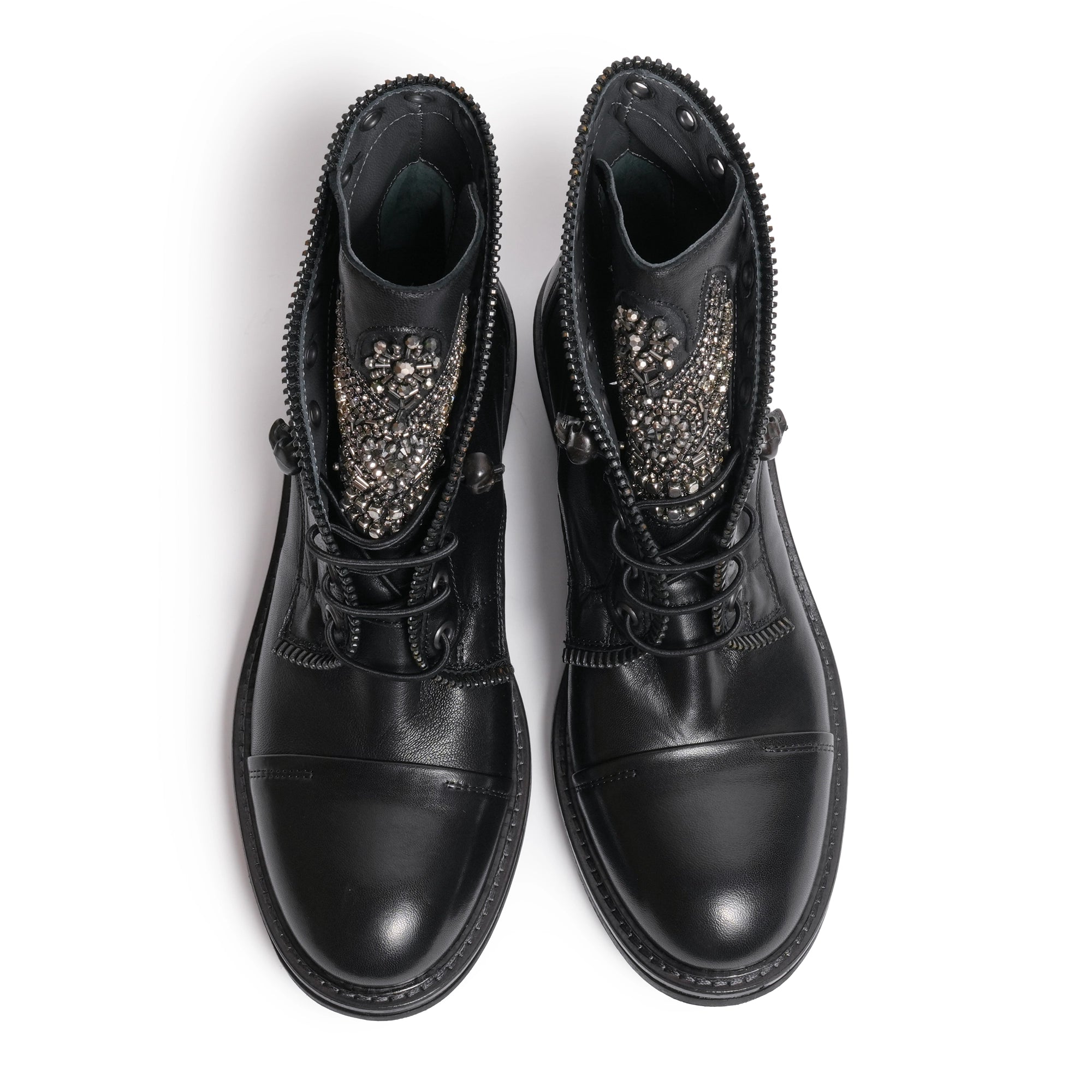 Crafted to combine edgy street style with refined glamour, these black leather booties feature intricate crystal embellishments that add a striking sparkle to their tough silhouette.