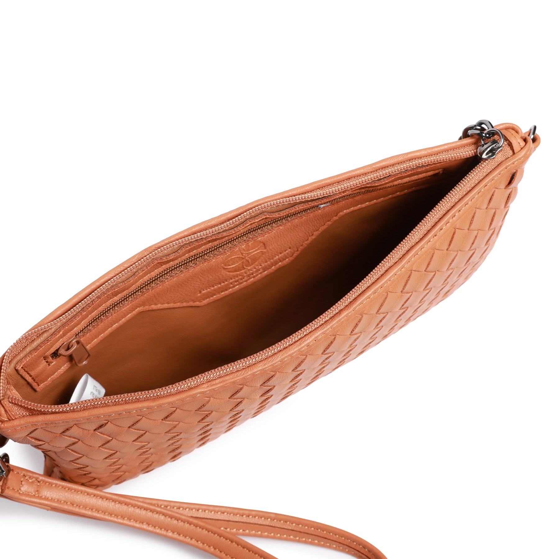 Featuring a secure zip-top closure, a sleek, softly structured silhouette, and a detachable leather wrist strap, it offers refined versatility for everyday sophistication. The handwoven intrecciato texture adds depth and character, while the spacious interior with a zip pocket keeps essentials perfectly organized.