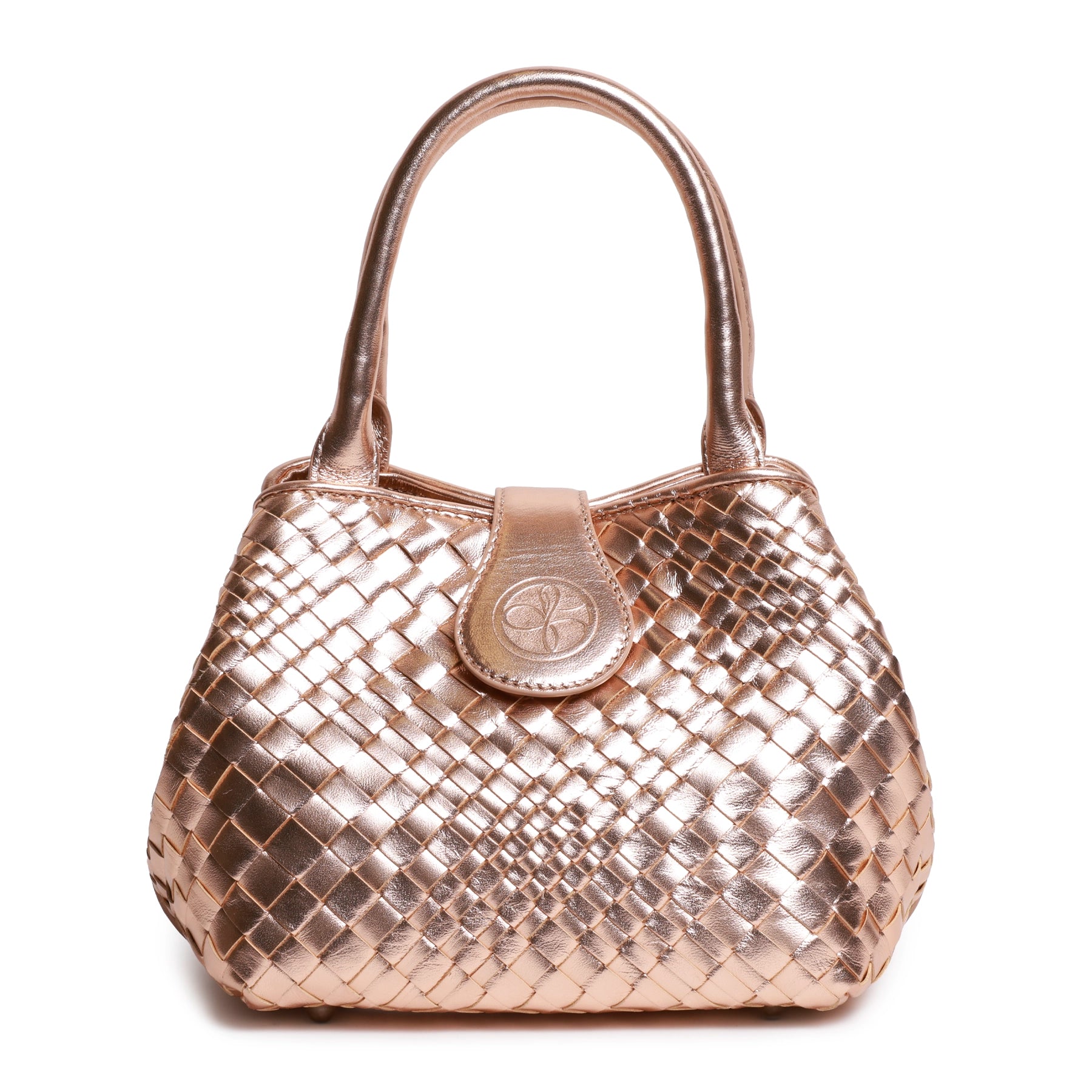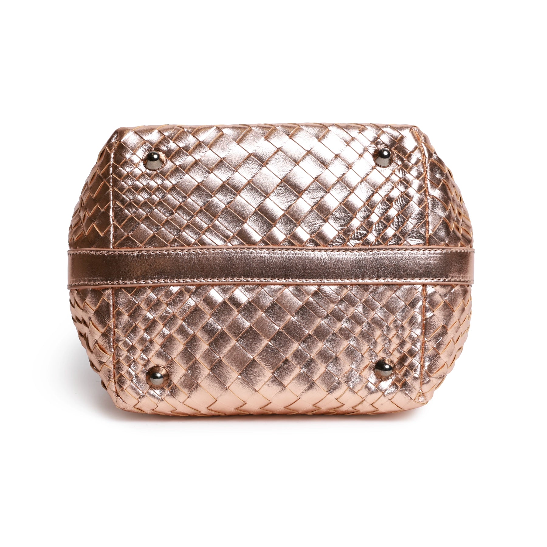 The Lucia Top Handle Bag in Intrecciato Optical Laminated Rose Gold is a striking blend of artisanal heritage and contemporary design. Handcrafted in Italy, it showcases the signature intrecciato weave reimagined in a bold optical pattern, creating a play of light and texture that stands out in any setting.