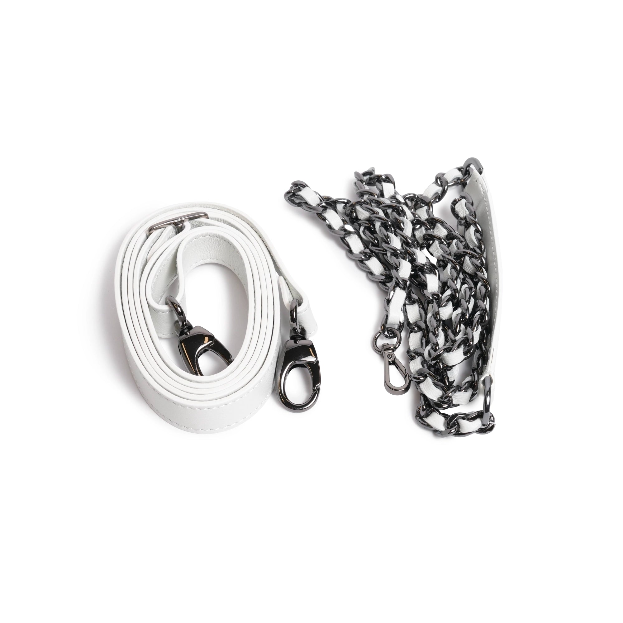 Designed for versatility, it features two interchangeable chains for a customizable crossbody style—one refined and elegant, the other more contemporary for day-to-night transitions. Inside, the bag is thoughtfully lined in suede, offering a soft, luxurious finish. An internal zippered pocket and additional compartment ensure your essentials are neatly organized while maintaining a sleek silhouette