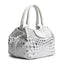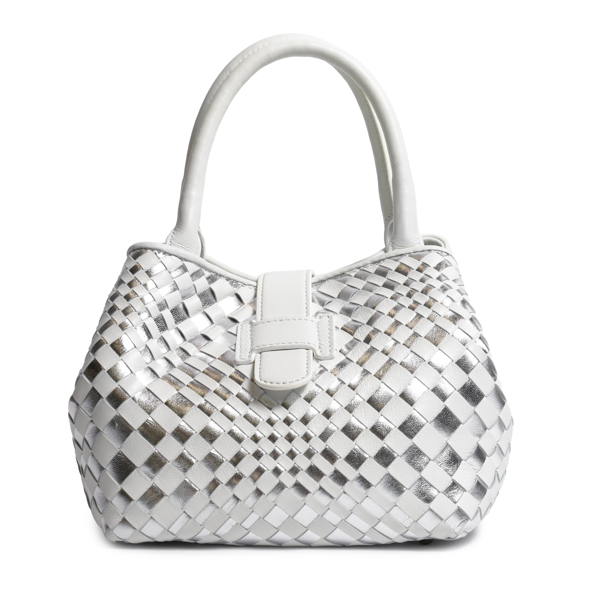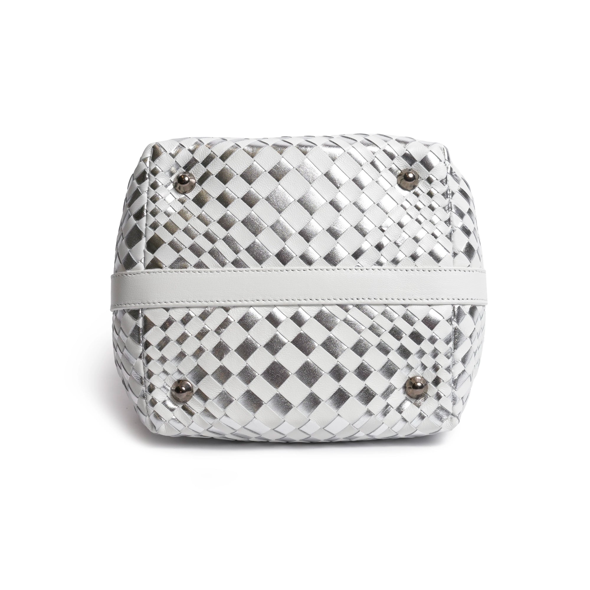 The Lucia Top Handle Bag in Intrecciato Optical Nappa White and Silver is a striking blend of artisanal heritage and contemporary design. Handcrafted in Italy, it showcases the signature intrecciato weave reimagined in a bold optical pattern, creating a play of light and texture that stands out in any setting.