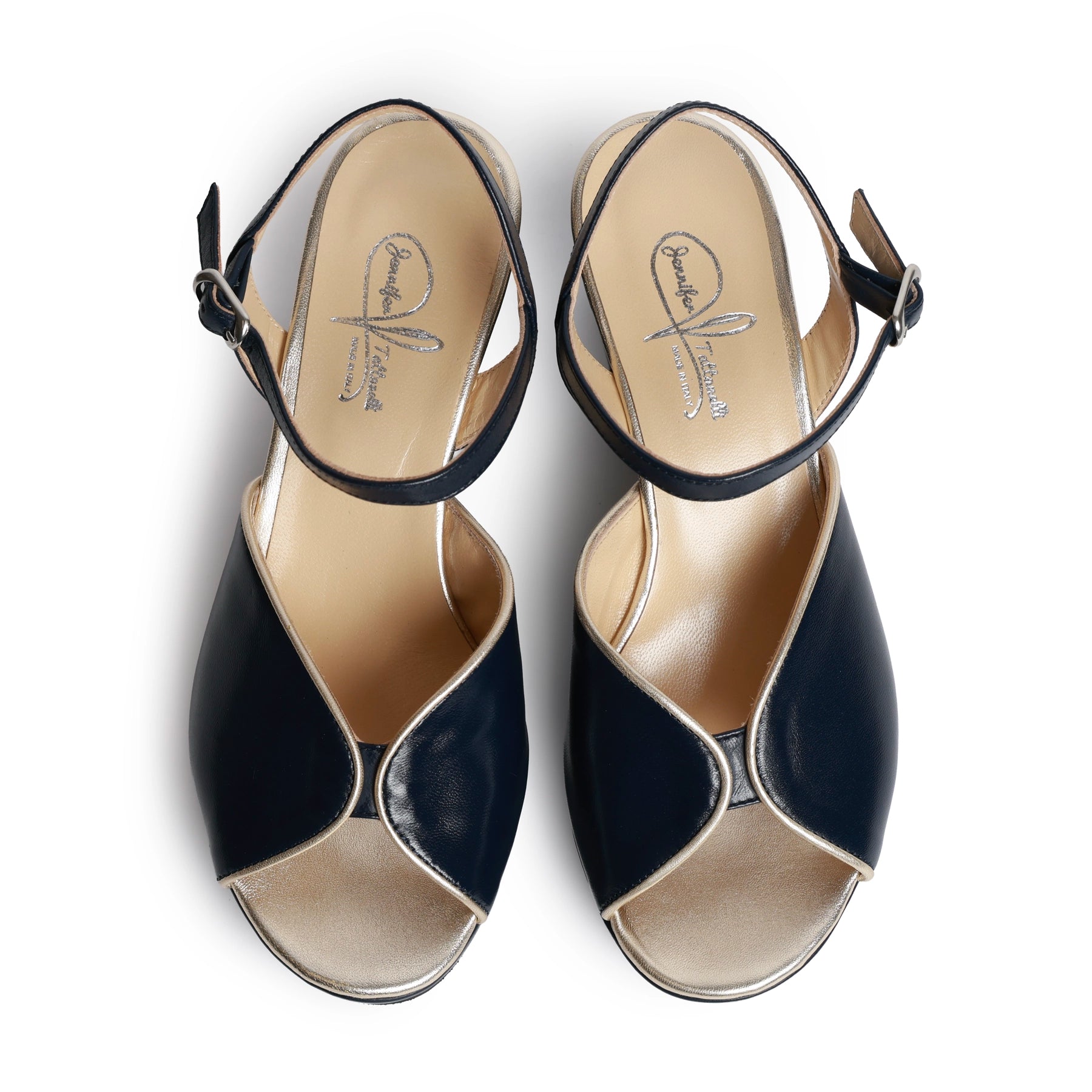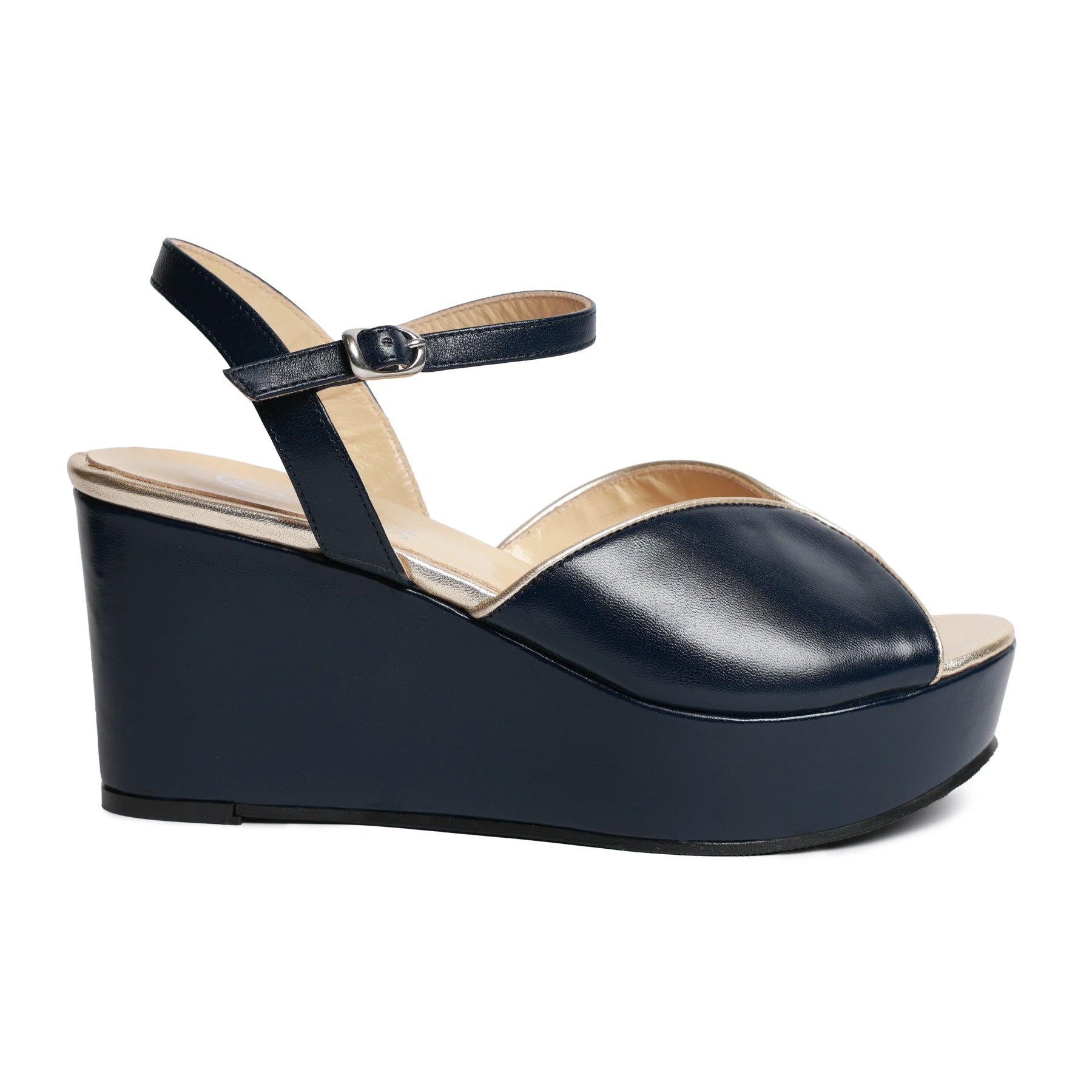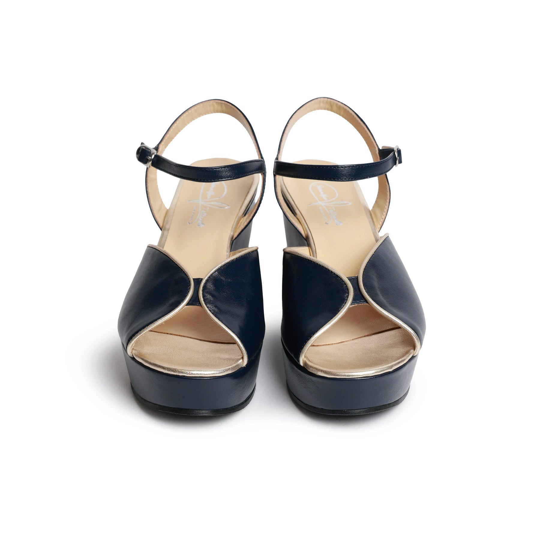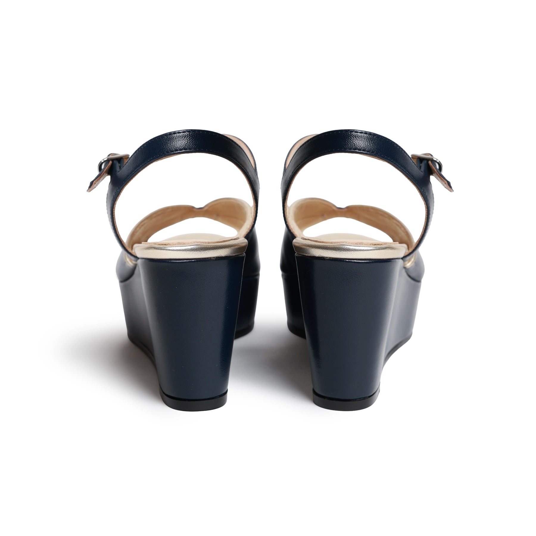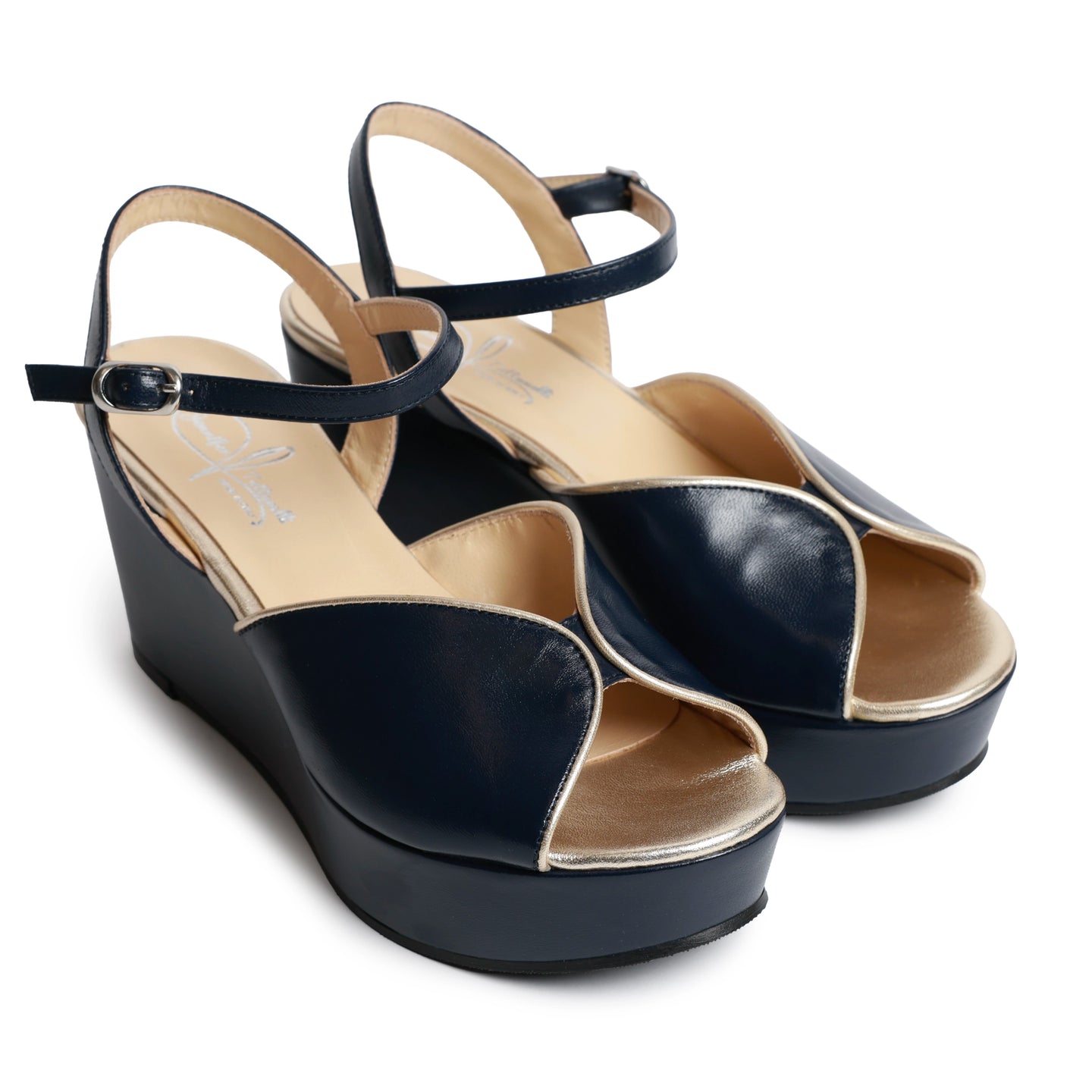 Refined and modern, these leather wedge sandals in carta da zucchero offer a sleek interpretation of everyday elegance. Crafted in Firenze, Italy, the smooth nappa leather upper is defined by its deep, inky blue tone, beautifully contrasted by soft metallic edging and a luminous leather footbed. The clean, sculptural lines give the silhouette a contemporary feel while maintaining timeless appeal.