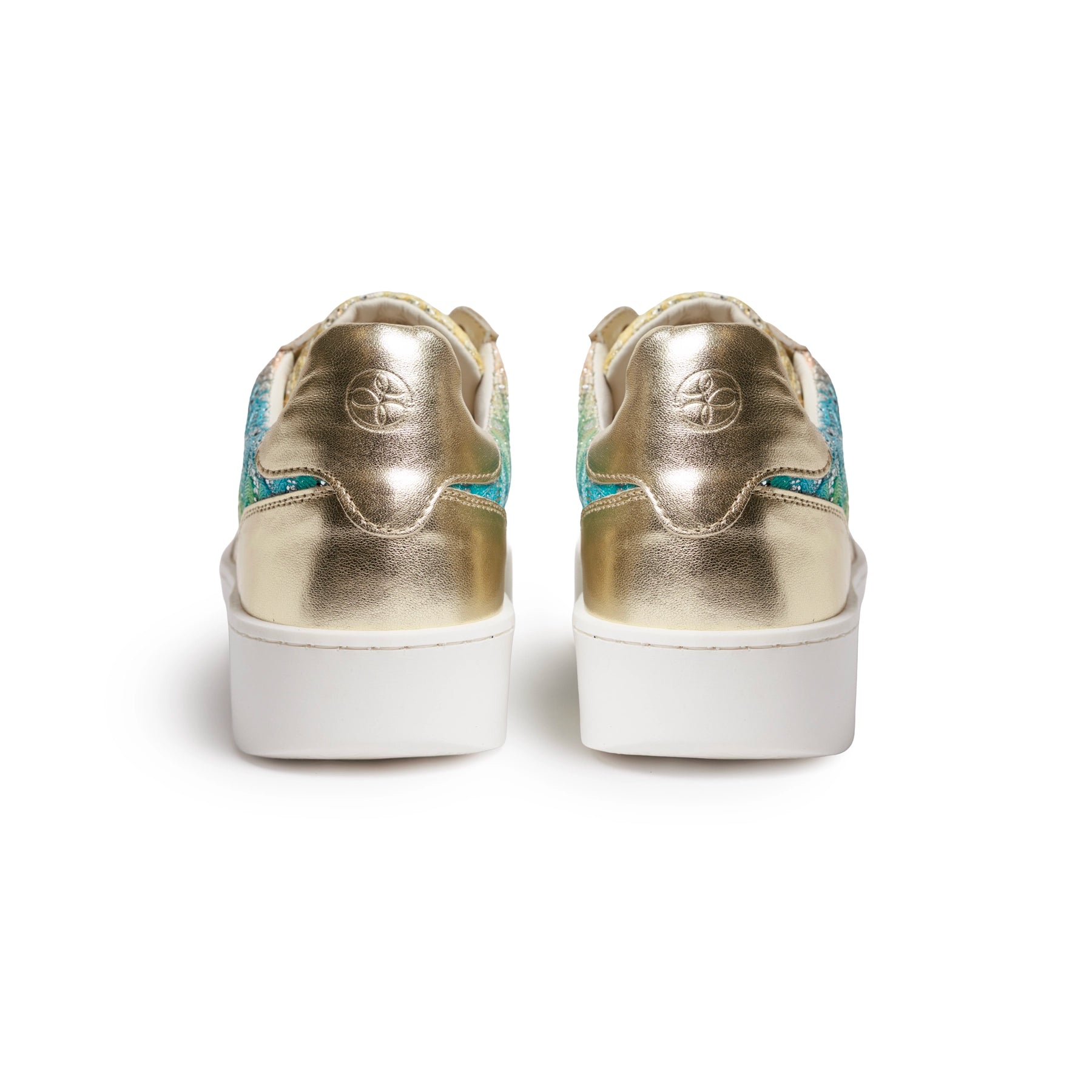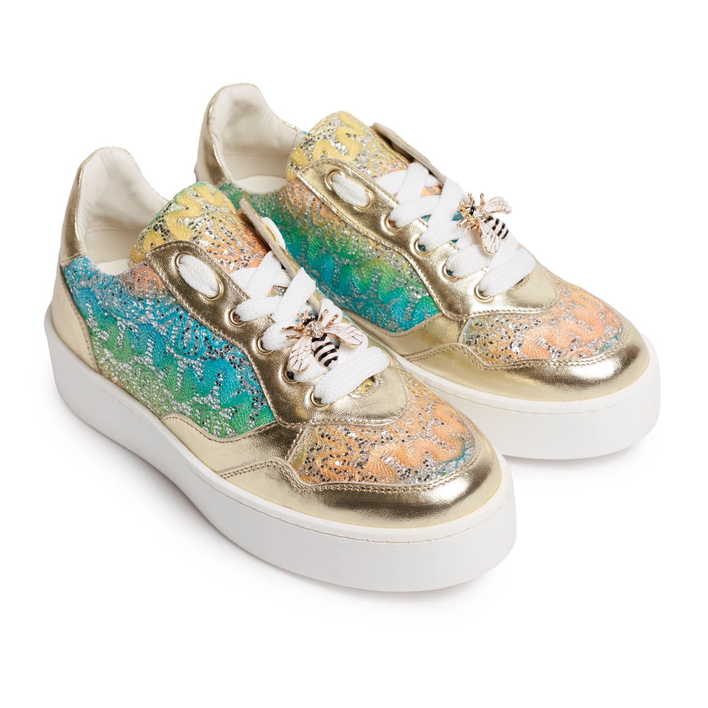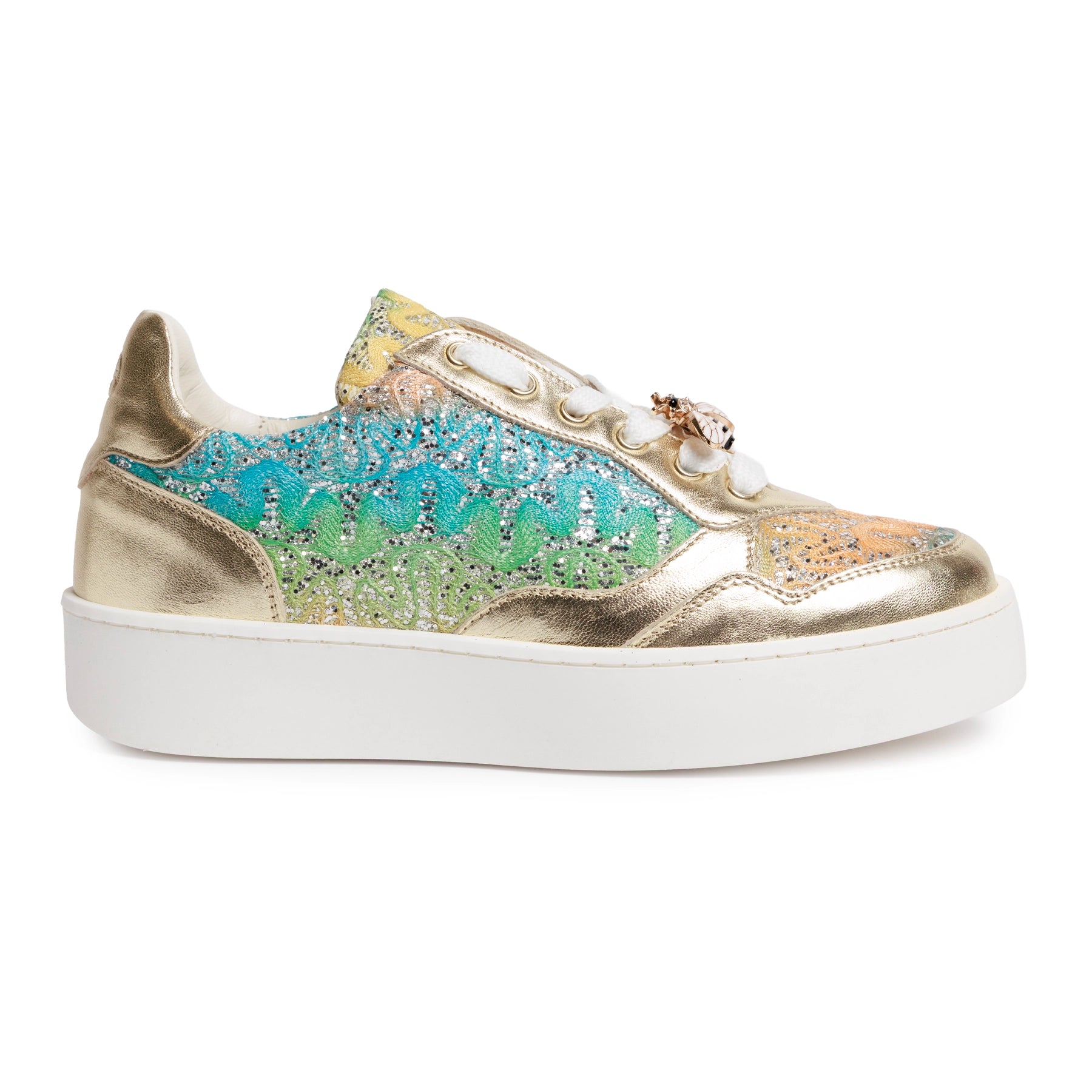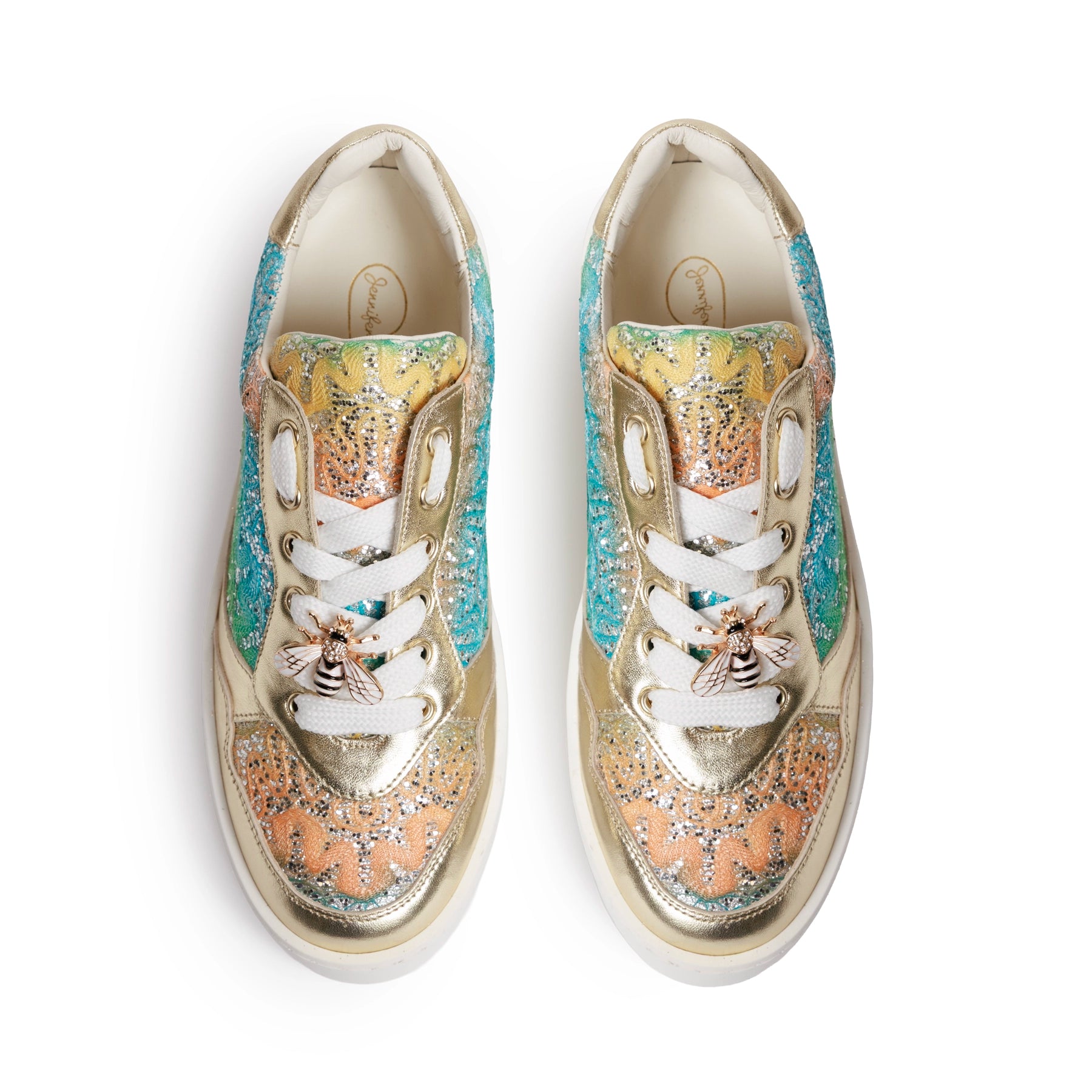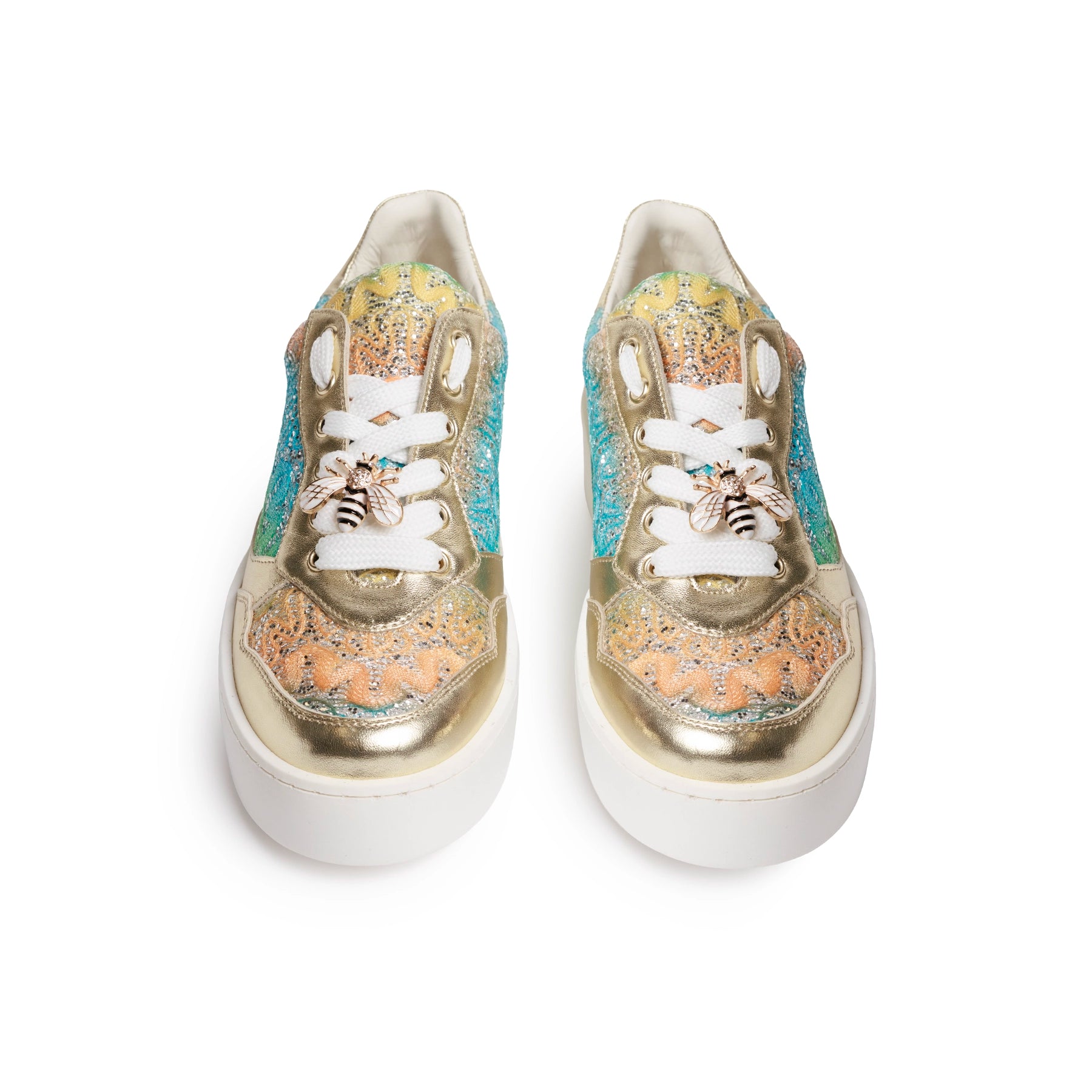 These platino laminated sneakers blend radiant laminated finishes with delicate pastel embroidery, creating a design that feels both luminous and artistic. The upper features shimmering gold-toned leather paired with intricately embroidered sections in soft gradients of turquoise, mint, and warm peach, offering a refined yet eye-catching color story. The textured embroidery adds depth and movement, enhancing the overall visual richness of the shoe.