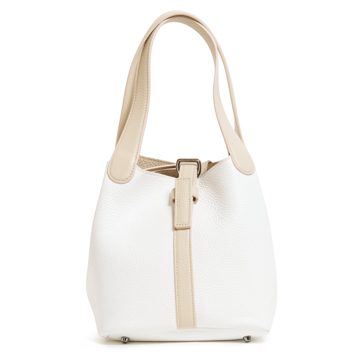 A top buckle strap secures the bag shut with a small top handle for comfortable carrying. Inside is a zip compartment for smaller essentials like your coins, identification, phone, and keys. The lovely beige/white color scheme matches well with a cotton or linen dress.