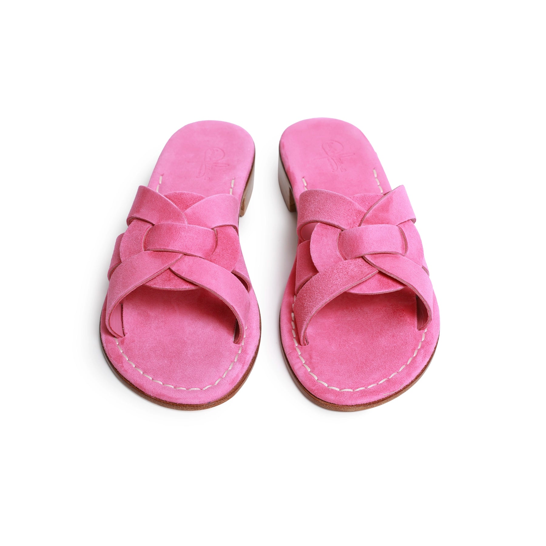 Crafted to elevate everyday elegance, this women’s slide sandal showcases refined Italian craftsmanship with a contemporary twist. Made from soft fuchsia suede, the sandal features a beautifully hand-woven intrecciato strap that adds texture, depth, and artisanal character to a clean, modern silhouette.
