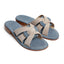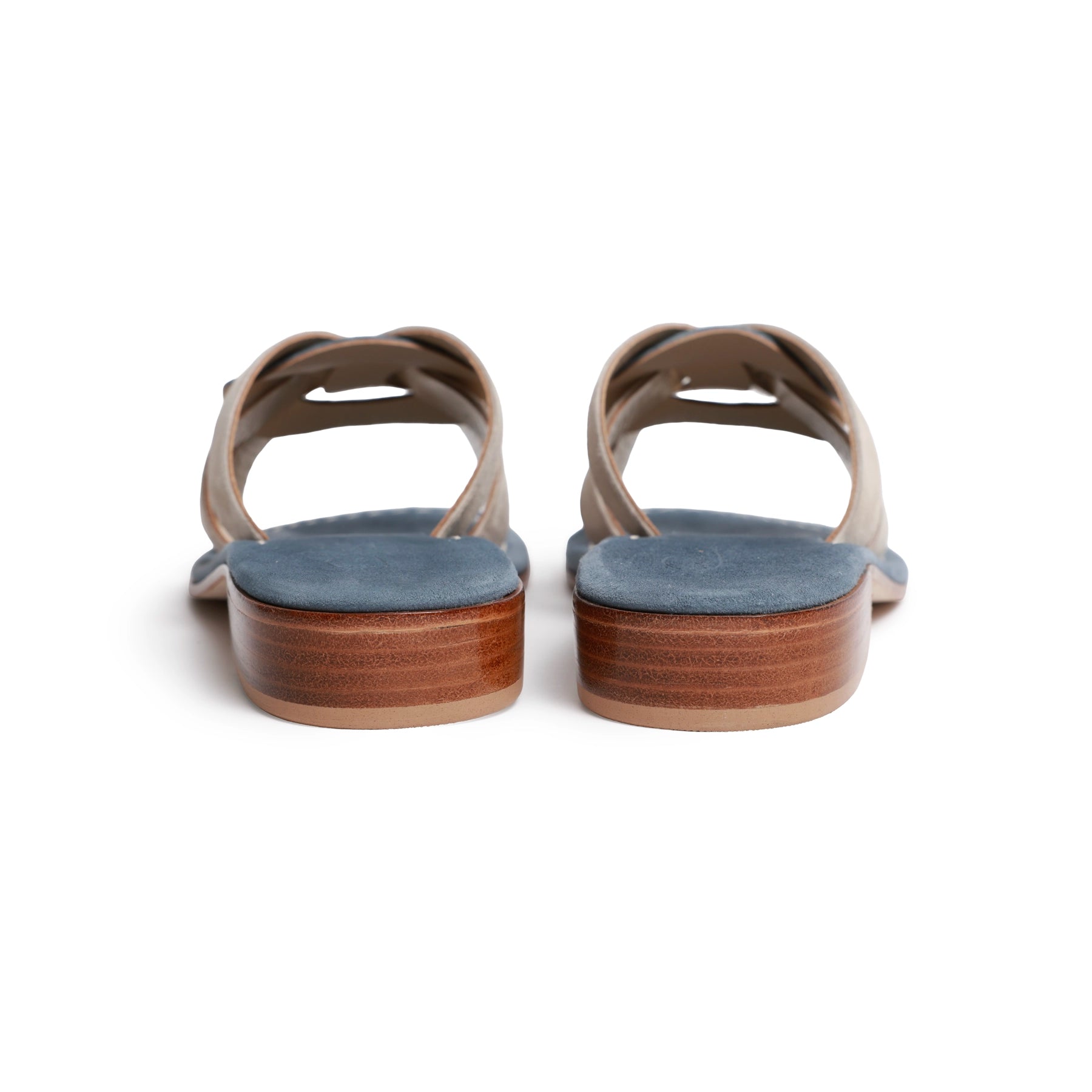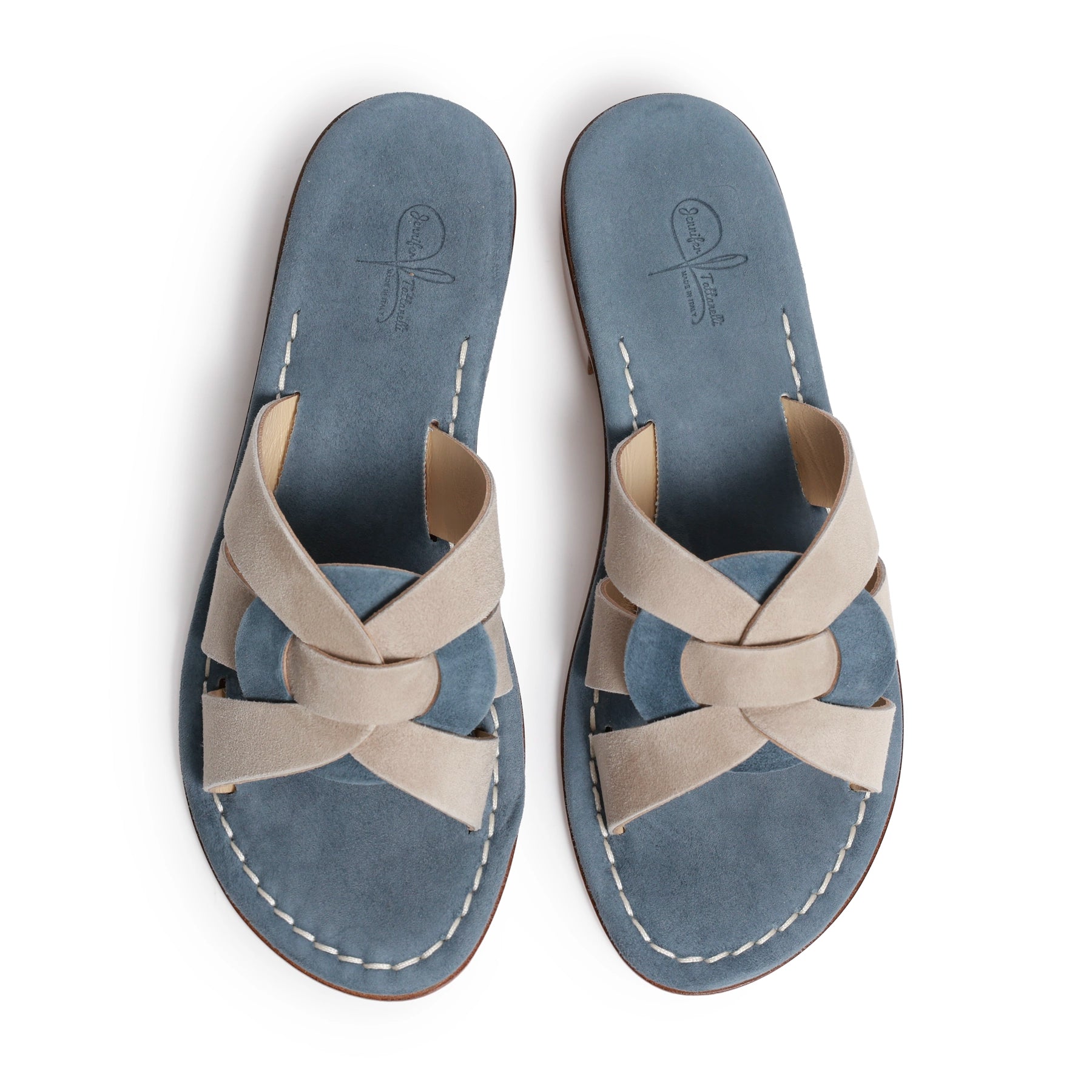 Crafted for effortless elegance, this women’s slide sandal is a refined expression of Italian artisanal craftsmanship. Made from ultra-soft suede in a sophisticated Osso shade, the sandal features a hand-worked intrecciato strap that creates a sculptural, woven effect across the foot. The neutral tone is elevated by a contrasting suede footbed in muted blue-grey, adding depth and modern character to the design.