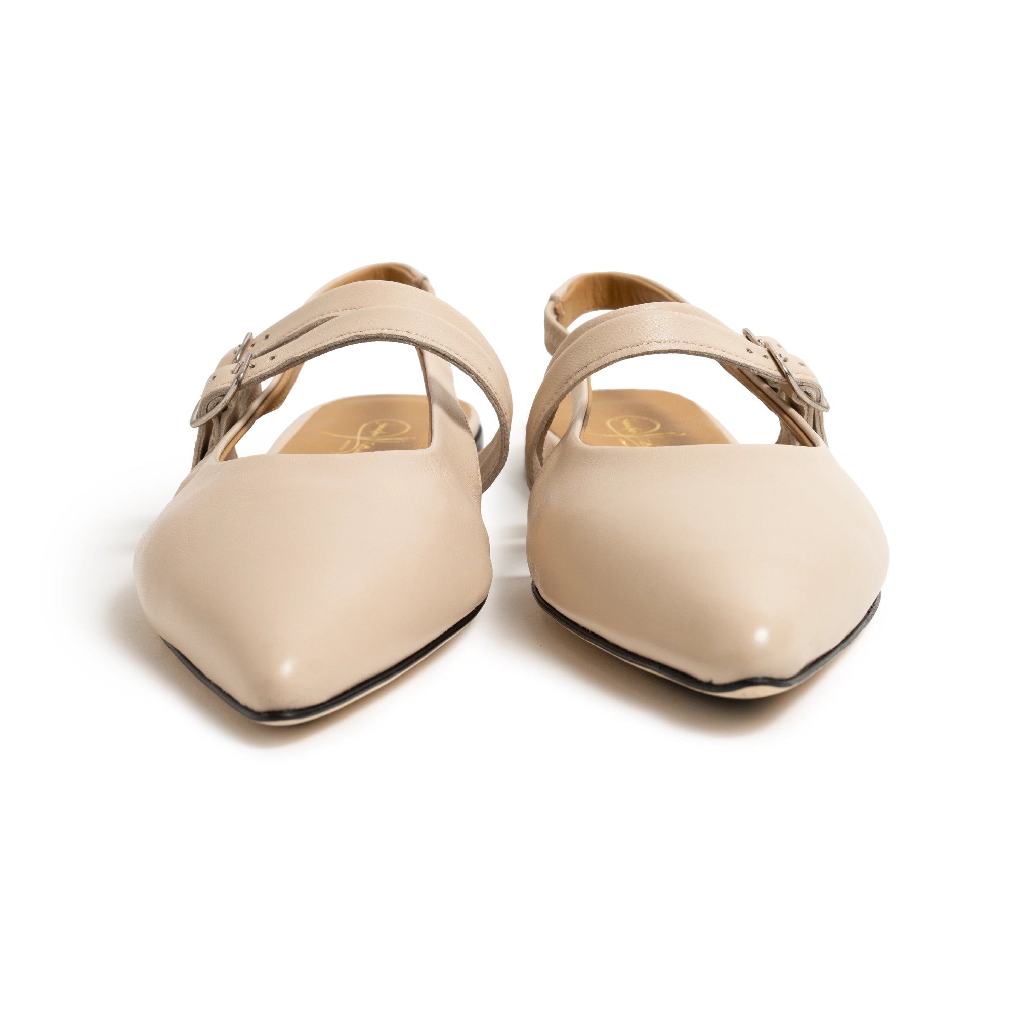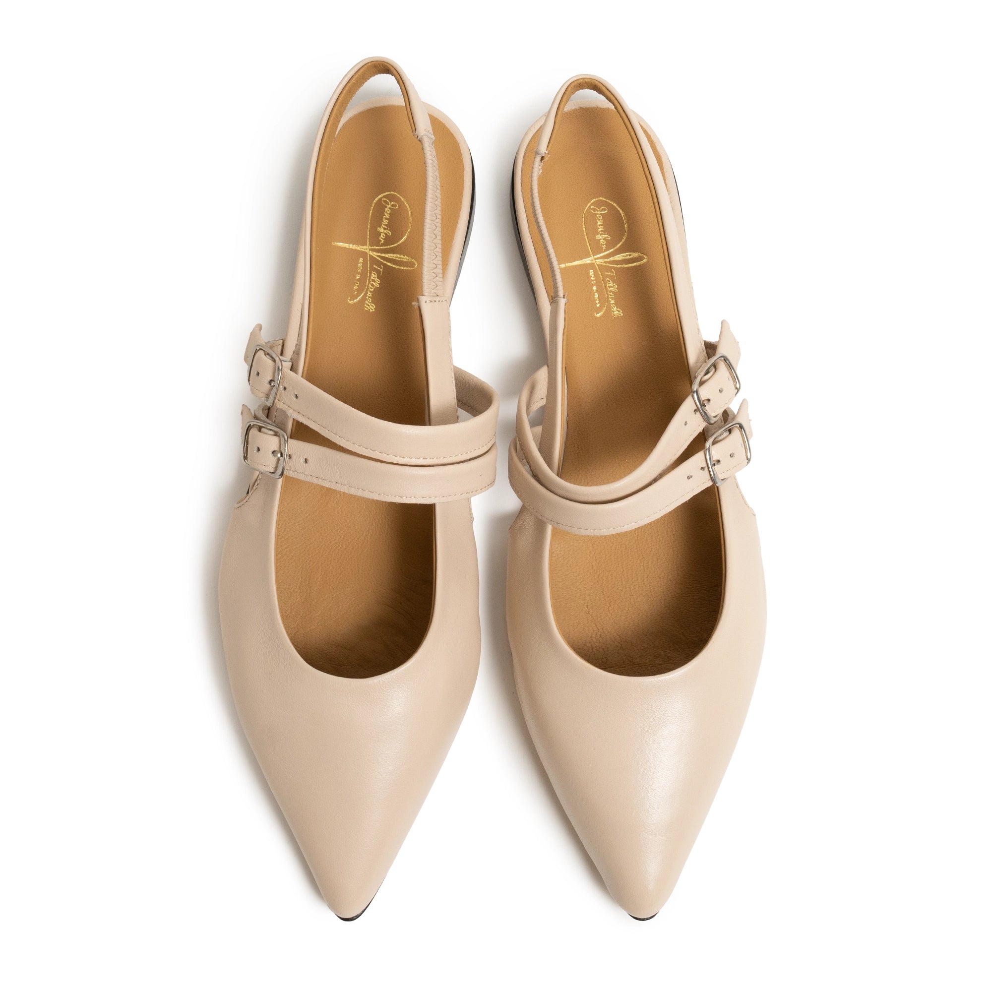 The design features a pointed toe and delicate double buckle straps, offering a secure yet elegant fit. The adjustable slingback provides flexibility and comfort for all-day wear, while the subtle Pewter tone reflects light with refined sophistication — a nod to the shimmering stone and metal hues found in the streets of Firenze.