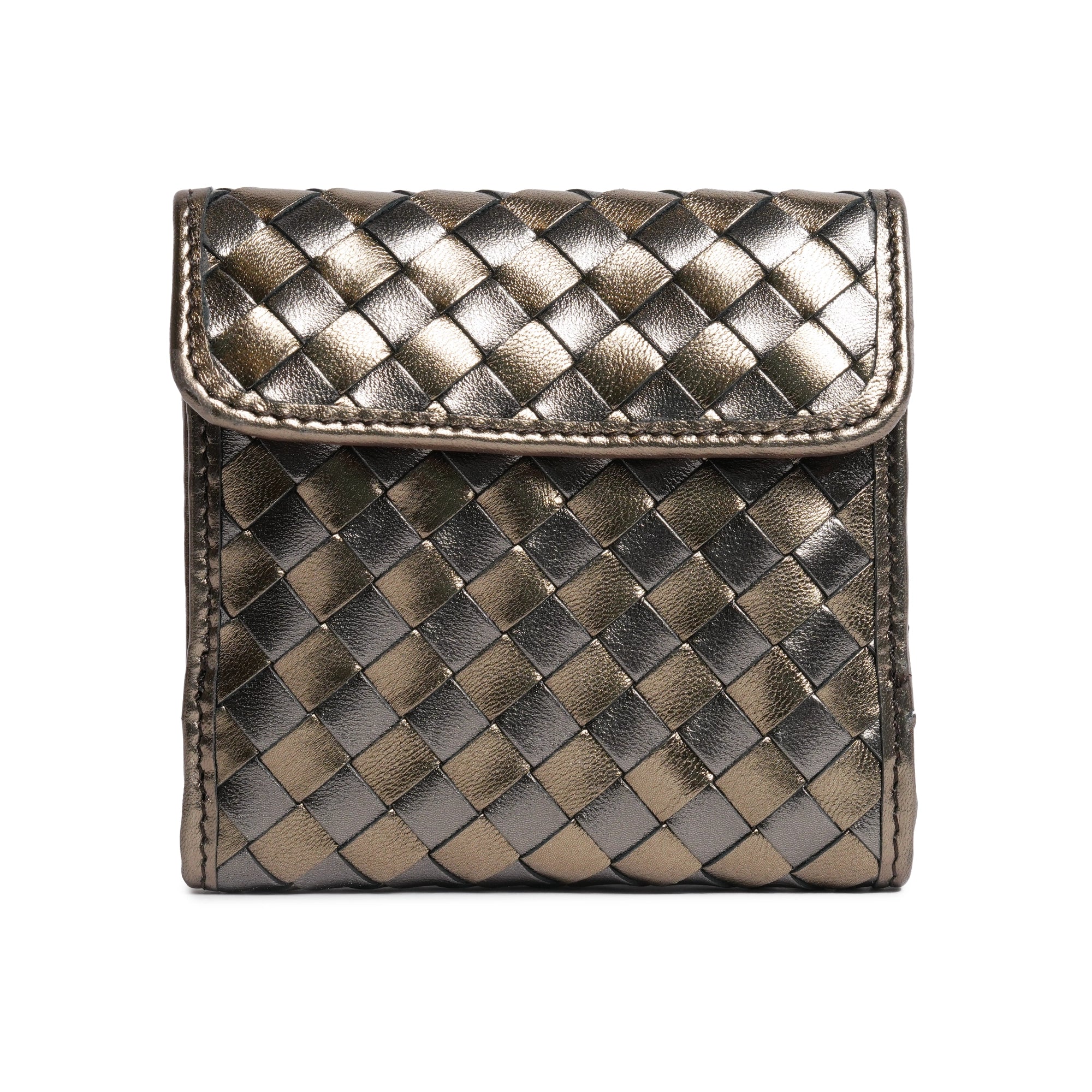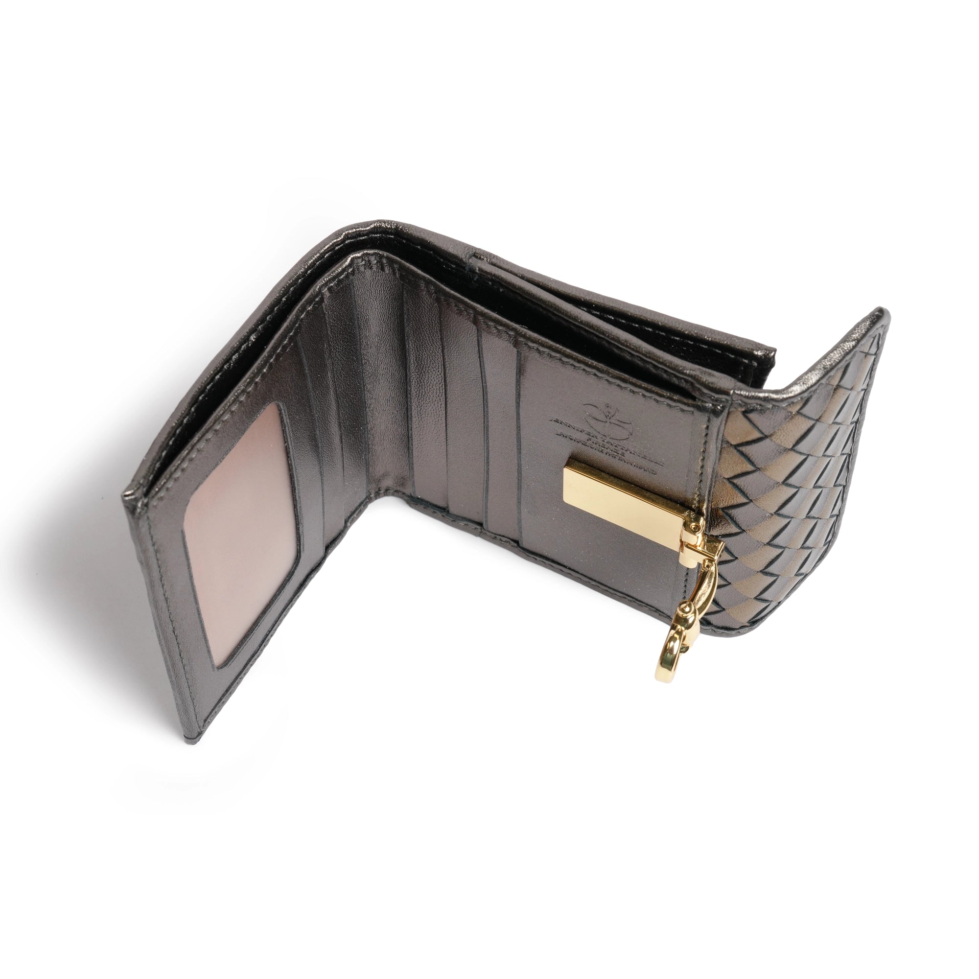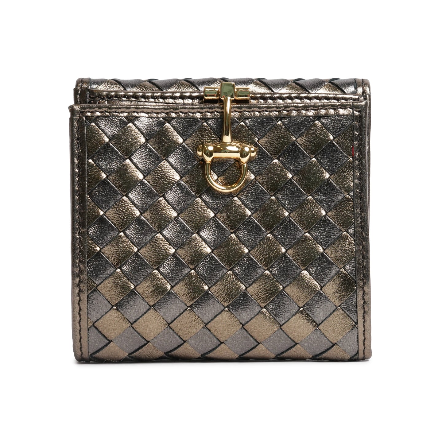 Despite its compact size, the Women's Small Leather Weaved Wallet in Bronze and Gunmetal offers excellent practicality for your daily on-the-go items, featuring various slots for your cash notes, coins, credit cards, and identification.