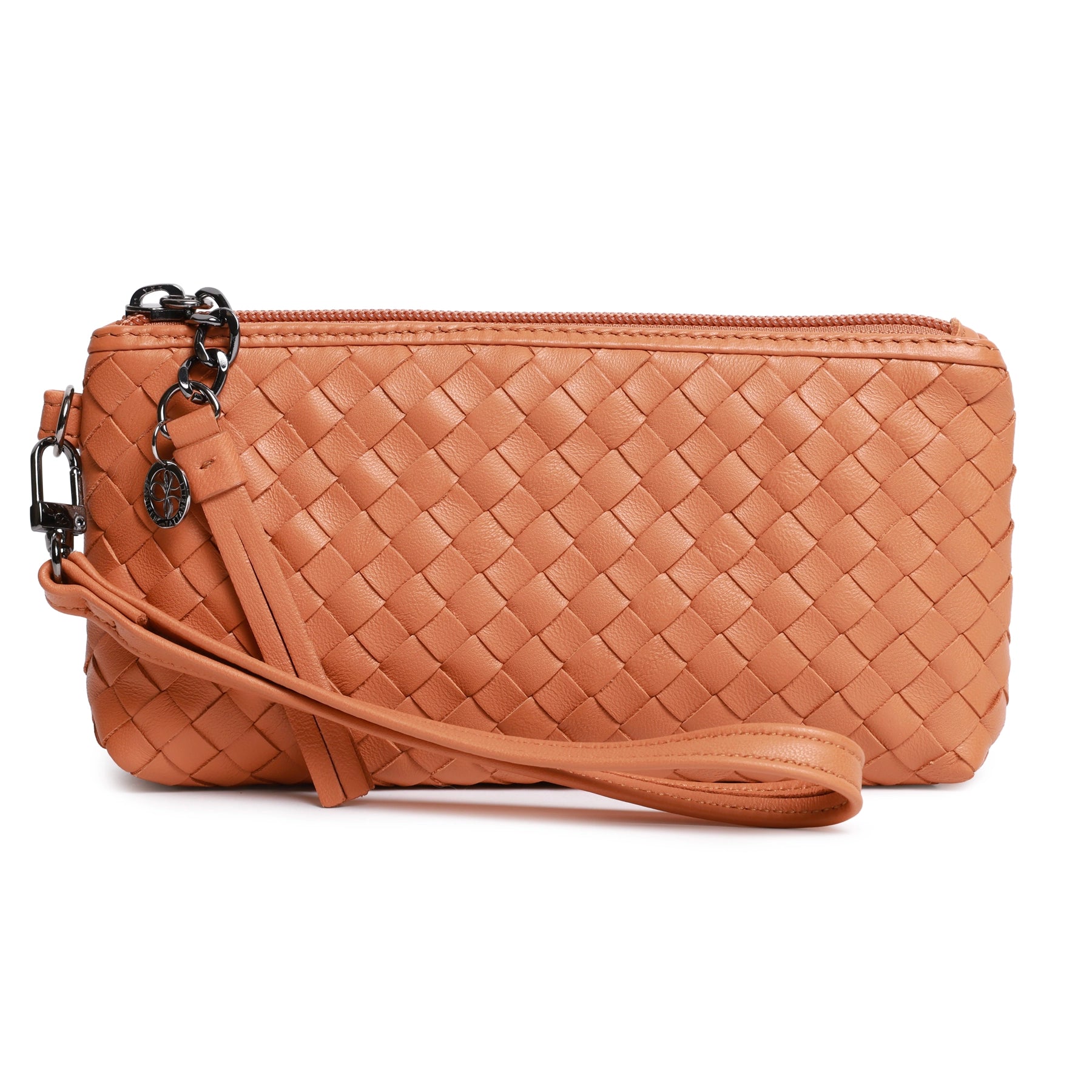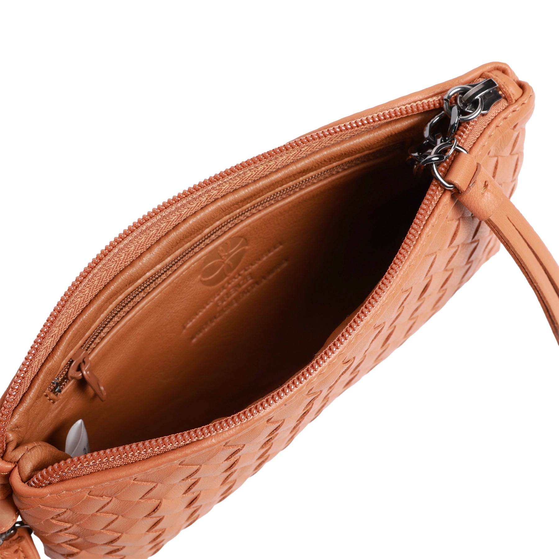 The Bruciato Tan shade reflects the warmth of coastal landscapes, pairing naturally with summer textures and neutral wardrobes. A top zip closure secures your belongings, while the removable wrist strap and crossbody strap allow versatile styling—carried as a clutch, worn on the wrist, or styled hands-free.